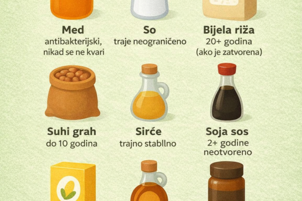🍯 MedPrirodno antibakterijski i samokonzervirajući. Nikada se ne kvari. 🧂 SolKlasični konzervans. Ostaje dobar neograničeno. 🍚 Bijela rižaMože trajati preko 20 godina kada se pravilno zatvori i skladišti. 🫘 Sušeni grahStabilno na polici do 10 godina kada se čuva na suhom. 🍶 SirćeZauvijek stabilno – njegova kiselost ga održava svježim neograničeno. 🥢 Soja sosNeotvorene boce…