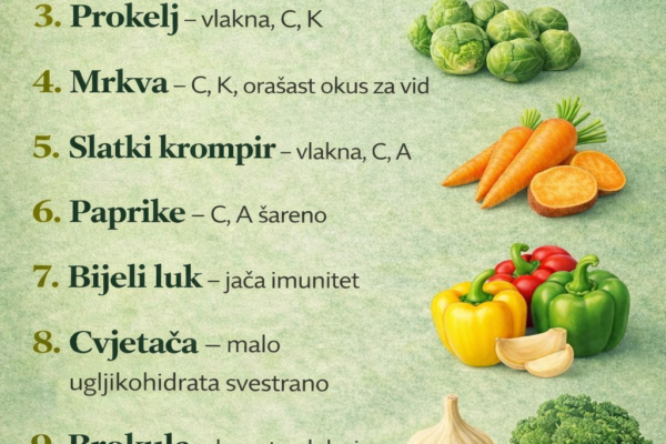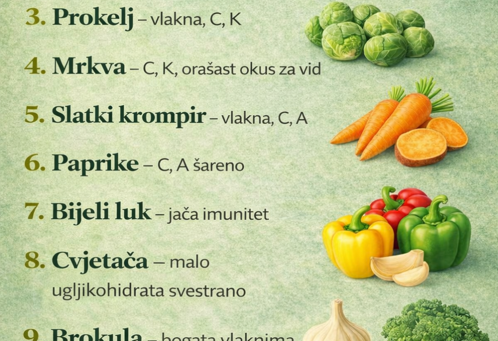 1. Špinat– bogat vitaminima C, A i K– dobar za vid, krv i kosti👉 Najbolji svjež ili kratko blanširan 2. Kelj– puno vitamina C, A i kalcija– jača imunitet i kosti👉 odličan kuhan ili dinstan 3. Brokoli– vlakna + vitamini C i K– štiti srce i probavu👉 kuhati kratko na pari 4. Mrkva– vitamin A…