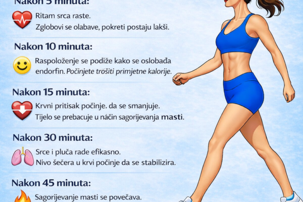 Hodanje je jedan od najlakših i najefikasnijih oblika vježbanja, ali njegov uticaj na tijelo se često podcjenjuje. Samo jedan sat hodanja može donijeti primjetna poboljšanja i fizičkog i mentalnog zdravlja. U prvih nekoliko minuta, vaše tijelo počinje da se zagrijava kako se cirkulacija krvi povećava. Mišići postaju aktivniji, a broj otkucaja srca se blago povećava,…