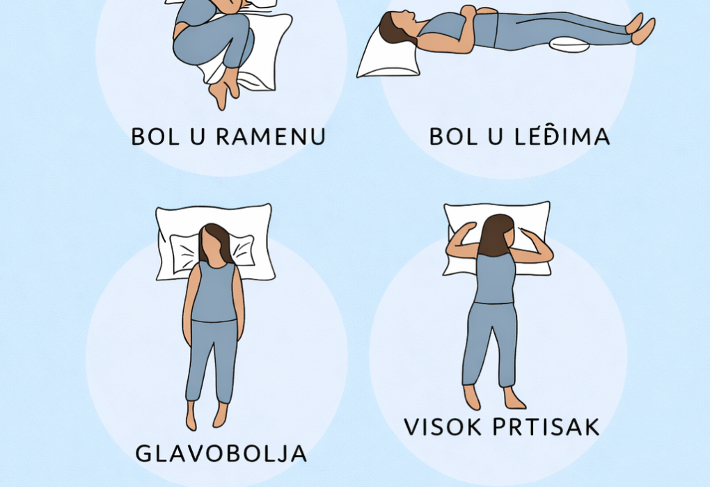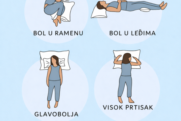 Za bol u ramenimaSpavajte na boku s jastukom između koljena i ispod glave radi pravilnog poravnanja tijela. Za bol u leđimaLezite na leđima s malim jastukom ispod koljena kako biste smanjili pritisak na kičmu. Za glavoboljeSpavajte ravno na leđima s pravilnom potporom vrata – izbjegavajte okretanje glave pod neugodnim uglom. Za visok krvni pritisakOdmarajte na…