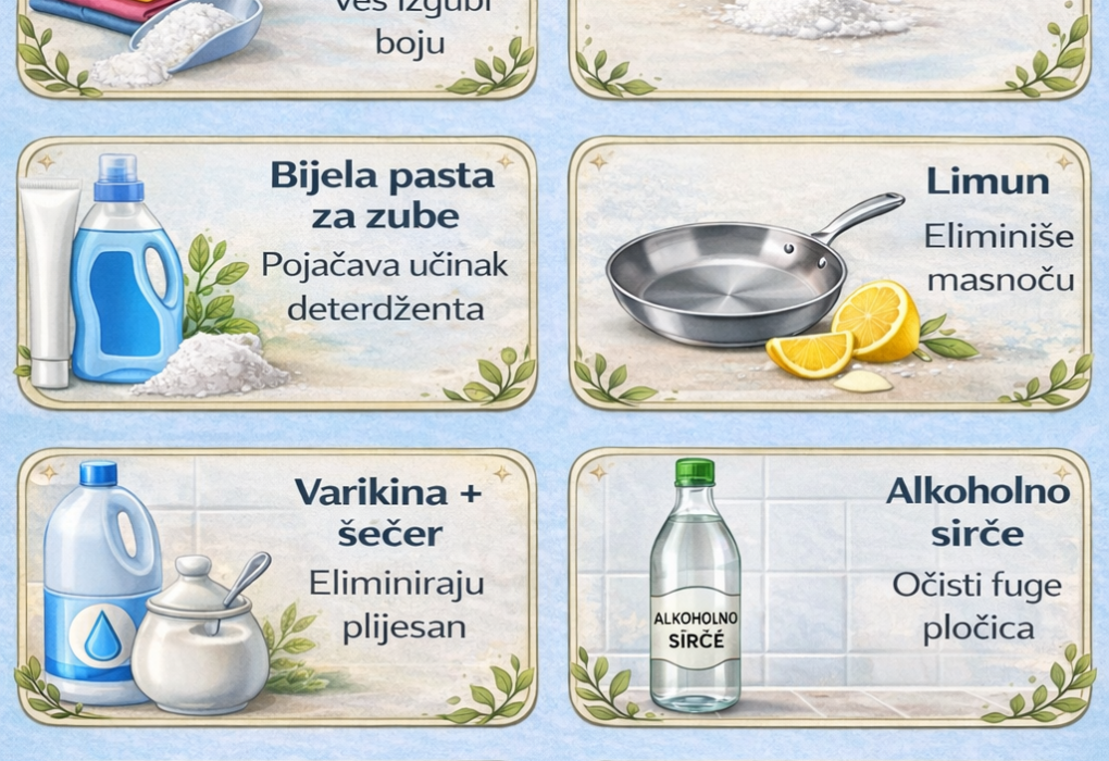 Ponekad, mala promjena načina na koji koristimo svakodnevne proizvode može olakšati čišćenje i njegu kuće. Nekoliko uobičajenih sastojaka nudi praktična i funkcionalna rješenja. 🧂 Sol u pranjuMože pomoći u održavanju živosti boja na određenim odjevnim predmetima. 🍋 Limun sa soliKorisna kombinacija za tretiranje mrlja od hrđe na kompatibilnim površinama. 🪥 Bijela pasta za zubeMože poboljšati…