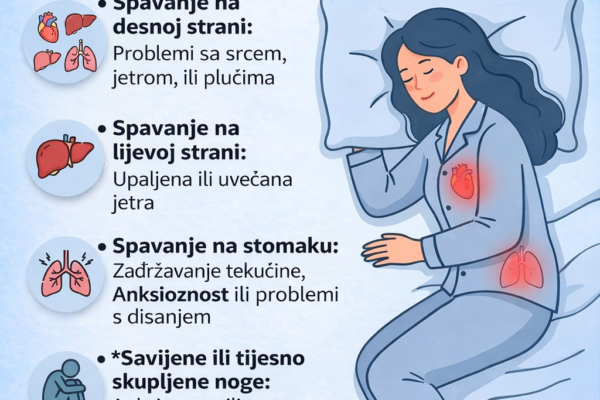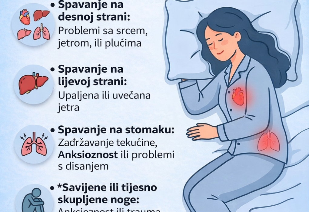 Način na koji spavate svake noći može otkriti više o vašem zdravlju nego što mislite. Različiti položaji spavanja mogu uticati na vaše disanje, probavu, cirkulaciju, pa čak i nivo stresa. Iako same navike spavanja ne dijagnosticiraju medicinska stanja, mogu dati korisne signale o vašem tijelu. 🌙 Zdravstveni uvidi iz položaja spavanja 1. Spavanje na desnoj…