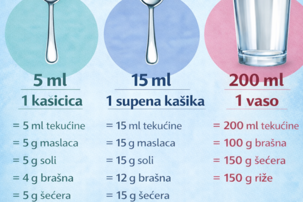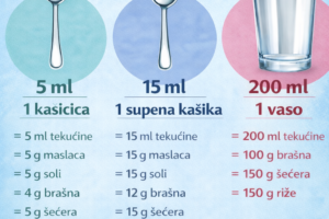 Ne trebate uvijek vagu za preciznu pripremu recepata. S uobičajenim kuhinjskim priborom možete dobiti vrlo približne i praktične količine. 🥄 1 čajna kašičica (5 ml)Ovo odgovara 5 ml bilo koje tekućine, 5 grama soli ili šećera i oko 4 grama brašna. 🥄 1 supena kašika (15 ml)Ovo odgovara 15 ml tekućine, 15 grama soli ili…