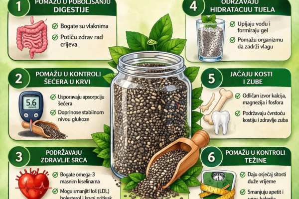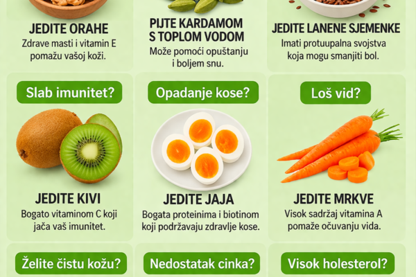 Zdrava prehrana igra vitalnu ulogu u održavanju općeg blagostanja. Hrana koju jedemo svaki dan može direktno utjecati na našu kožu, san, imunitet, pa čak i na kronična stanja poput bolova u zglobovima ili visokog kolesterola. Ova infografika ističe jednostavne, prirodne namirnice koje mogu pomoći u rješavanju uobičajenih zdravstvenih problema. 🌿 Ključne namirnice i njihove zdravstvene…
