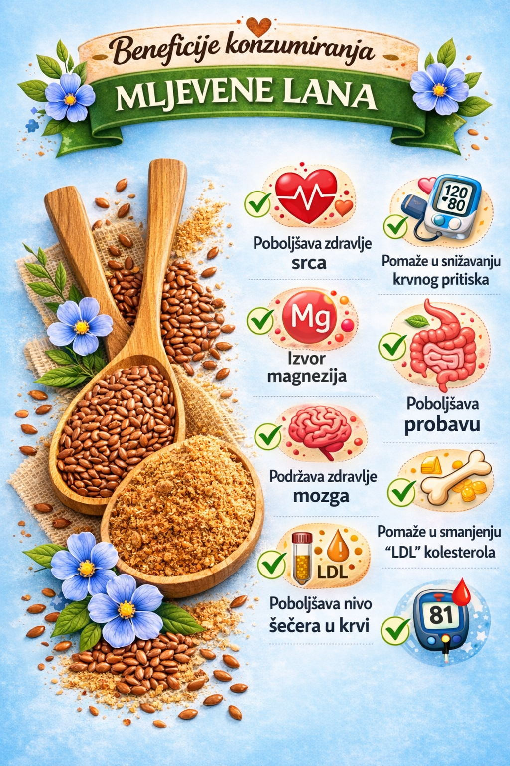 Mljeveno laneno sjeme je odličan saveznik za vaše srce, jer pruža rastvorljiva vlakna i alfa-linolensku kiselinu, biljnu mast koja doprinosi zdravoj ravnoteži lipida u krvi.