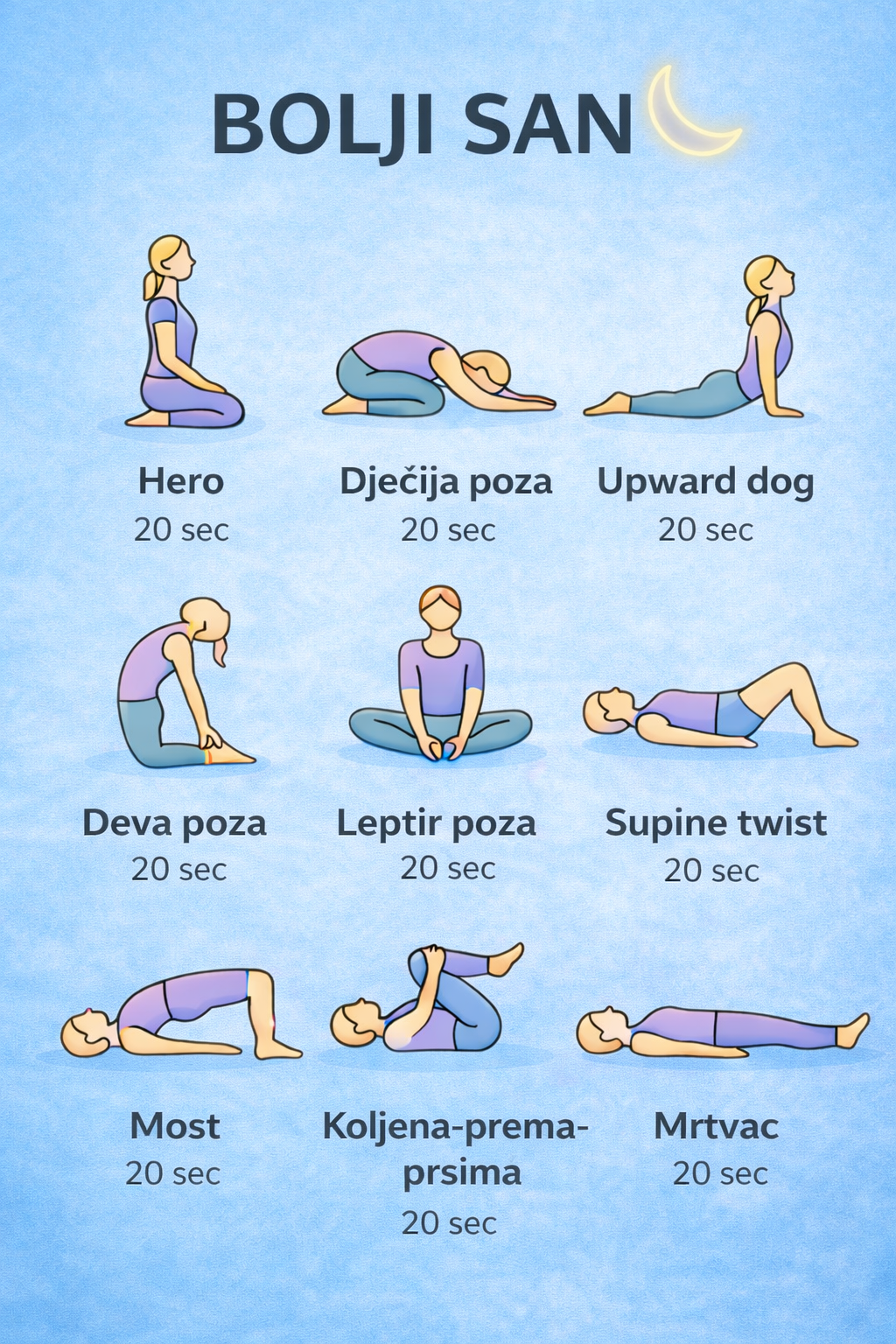 Kvalitetan san je ključan za zdravo tijelo i um. Ova slika prikazuje jednostavnu joga rutinu koja može pomoći u opuštanju mišića, smirivanju uma i pripremi tijela za dubok san. Svakodnevno vježbanje ovih poza – čak i samo 20 sekundi svaka – može napraviti primjetnu razliku.