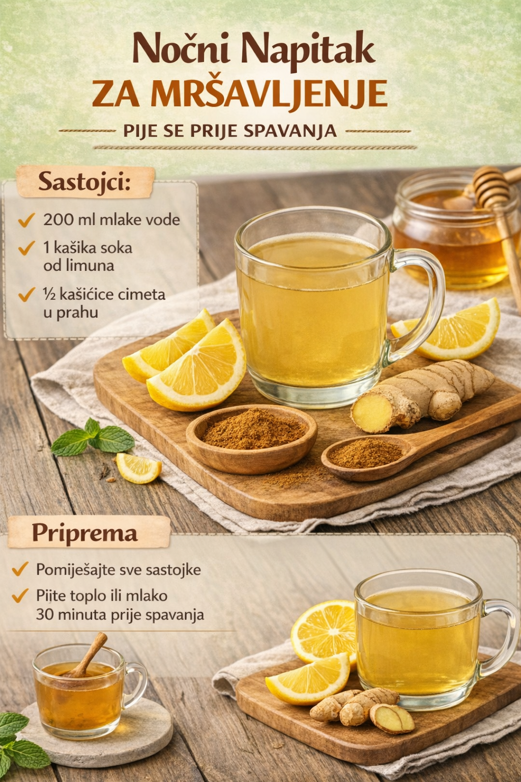 Pomiješajte otprilike 200 ml tople vode, 1 supenu kašiku limunovog soka i ½ kašičice mljevenog cimeta. Dobro promiješajte prije pijenja.