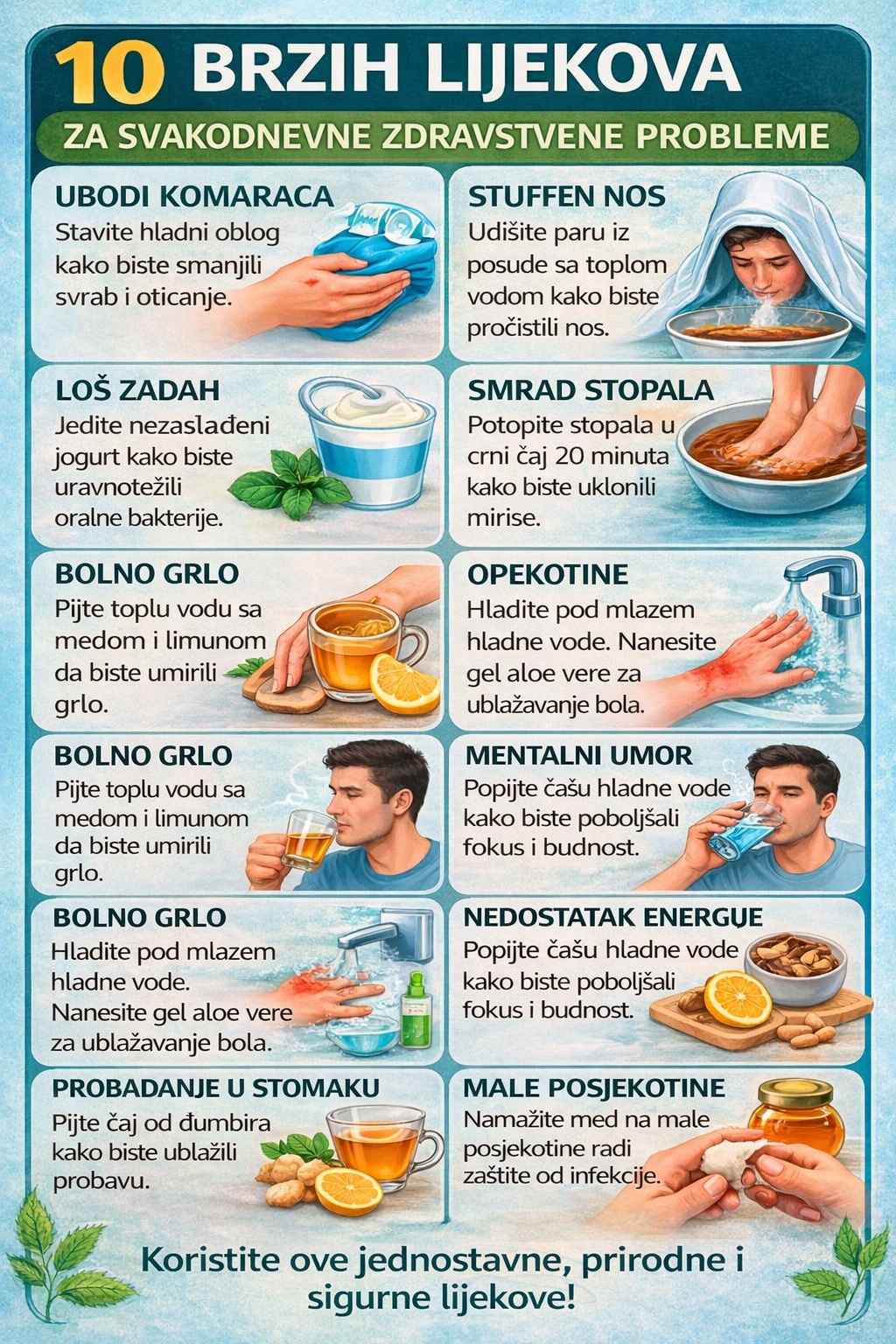 Prirodni lijekovi su jednostavni, pristupačni i učinkoviti načini za podršku vašem zdravlju. Iako su korisni kod manjih problema, uvijek se obratite ljekaru za ozbiljna stanja. Uključivanje ovih navika u vašu svakodnevnu rutinu može dovesti do zdravijeg i uravnoteženijeg načina života.