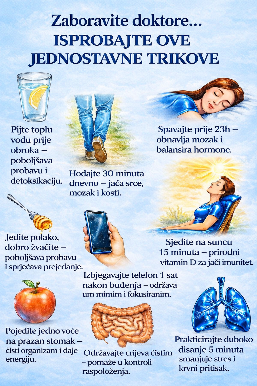 Ove jednostavne navike mogu se činiti malima, ali kada se dosljedno prakticiraju, mogu značajno poboljšati vaše fizičko i mentalno zdravlje. Međutim, one bi trebale dopuniti, a ne zamijeniti, stručne medicinske savjete.