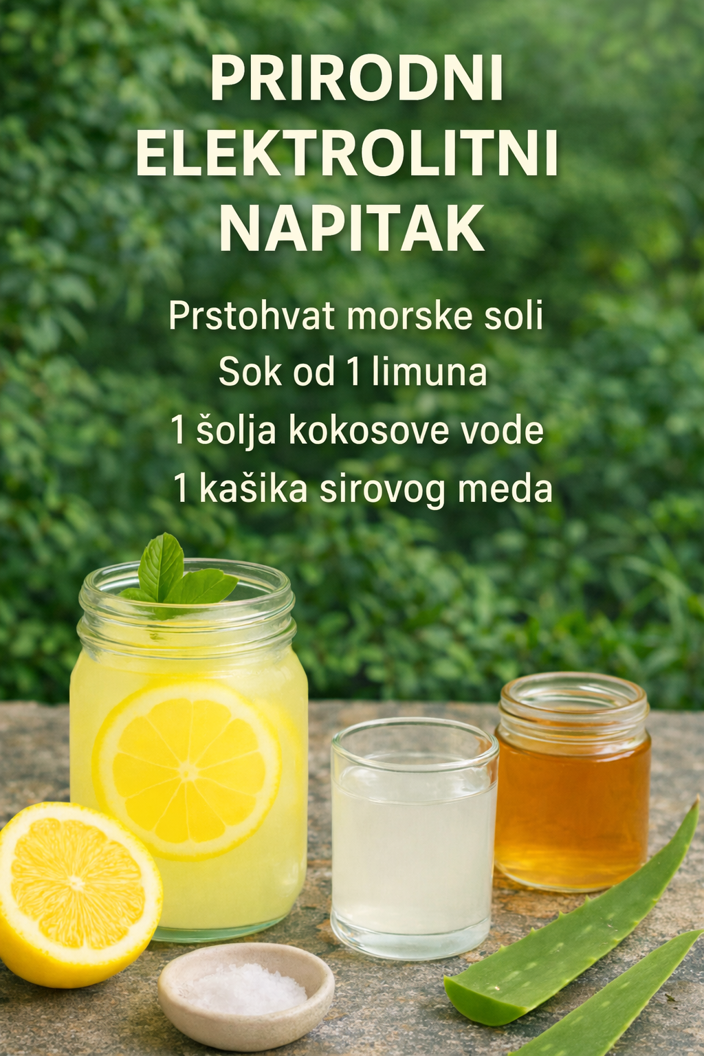 Kupovni energetski napici često su puni šećera, vještačkih aroma i konzervansa. Ali vašem tijelu ne trebaju hemikalije — trebaju vam pravi minerali. Jednostavan domaći elektrolitni napitak napravljen od morske soli, limunovog soka, kokosove vode i sirovog meda može mnogo efikasnije i prirodno vratiti hidrataciju. Ova mješavina podržava nivo energije bez naglog pada, što je idealno za svakodnevnu upotrebu.