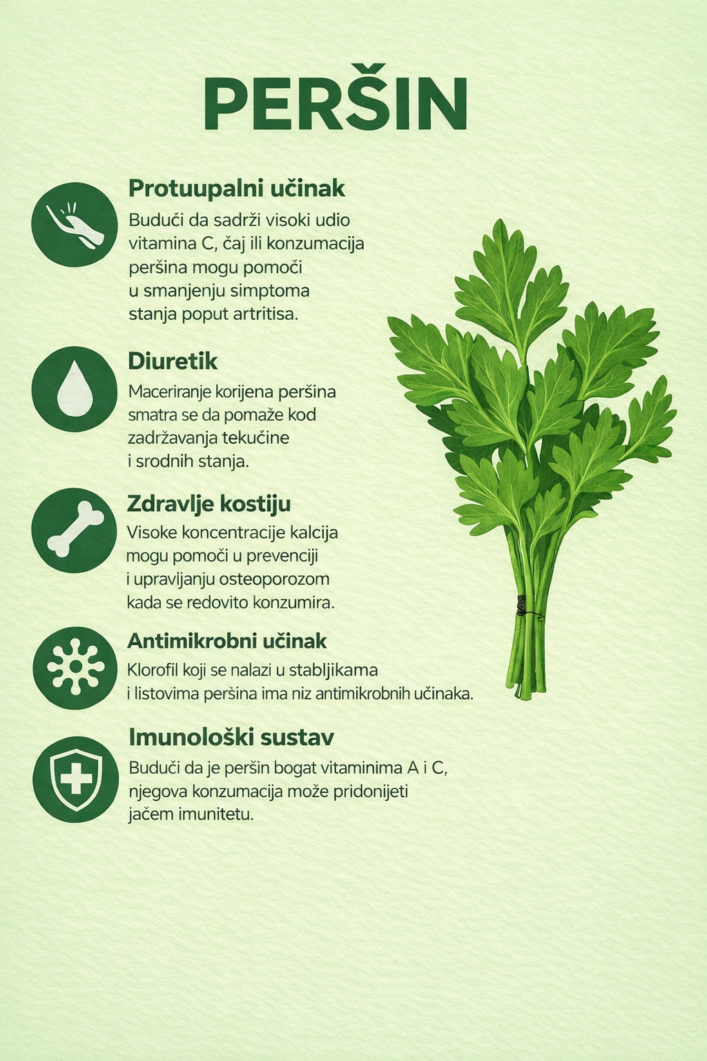 Peršin kao lijek je jedan od boljih prirodnih lijekova koji pruža bogatstvo vitamina i minerala. Peršin je bogat vitaminima A, E i C. Ovi vitamini doprinose očuvanju vida, čine kosu ljepšom, poboljšavaju pamćenje i jačaju imunitet.