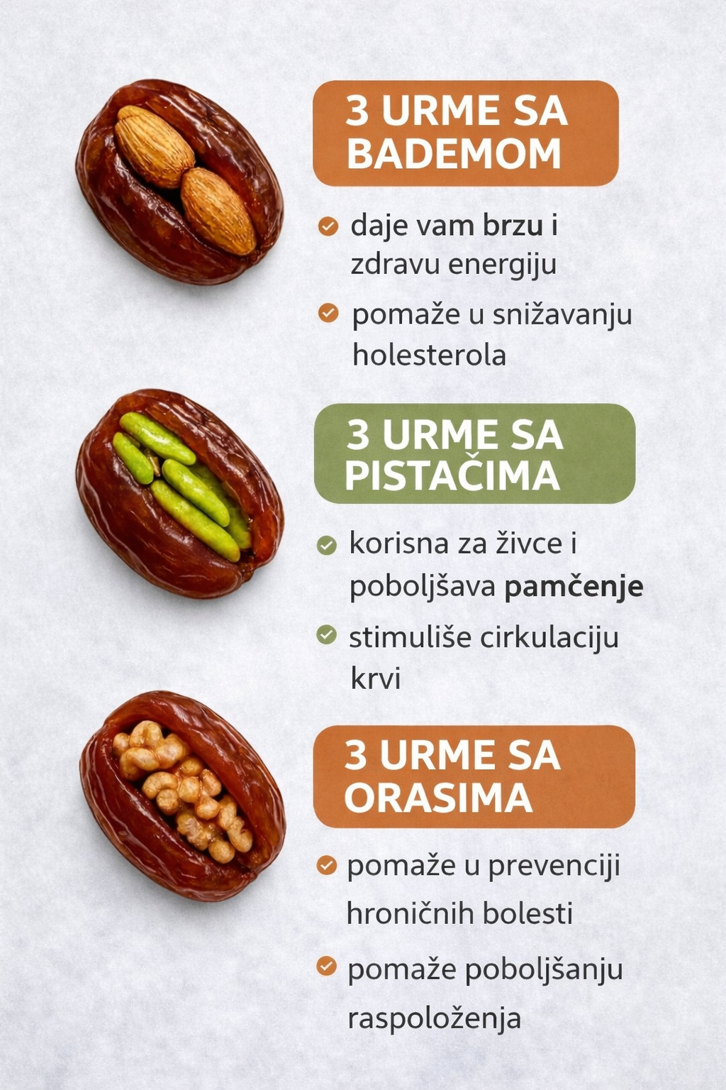 Hurme punjene bademima, pistacijama i orasima čine jednostavan i ukusan međuobrok. Jednostavni za pripremu i ukusni, najbolje se uklapaju u uravnoteženu ishranu kada se konzumiraju umjereno.
