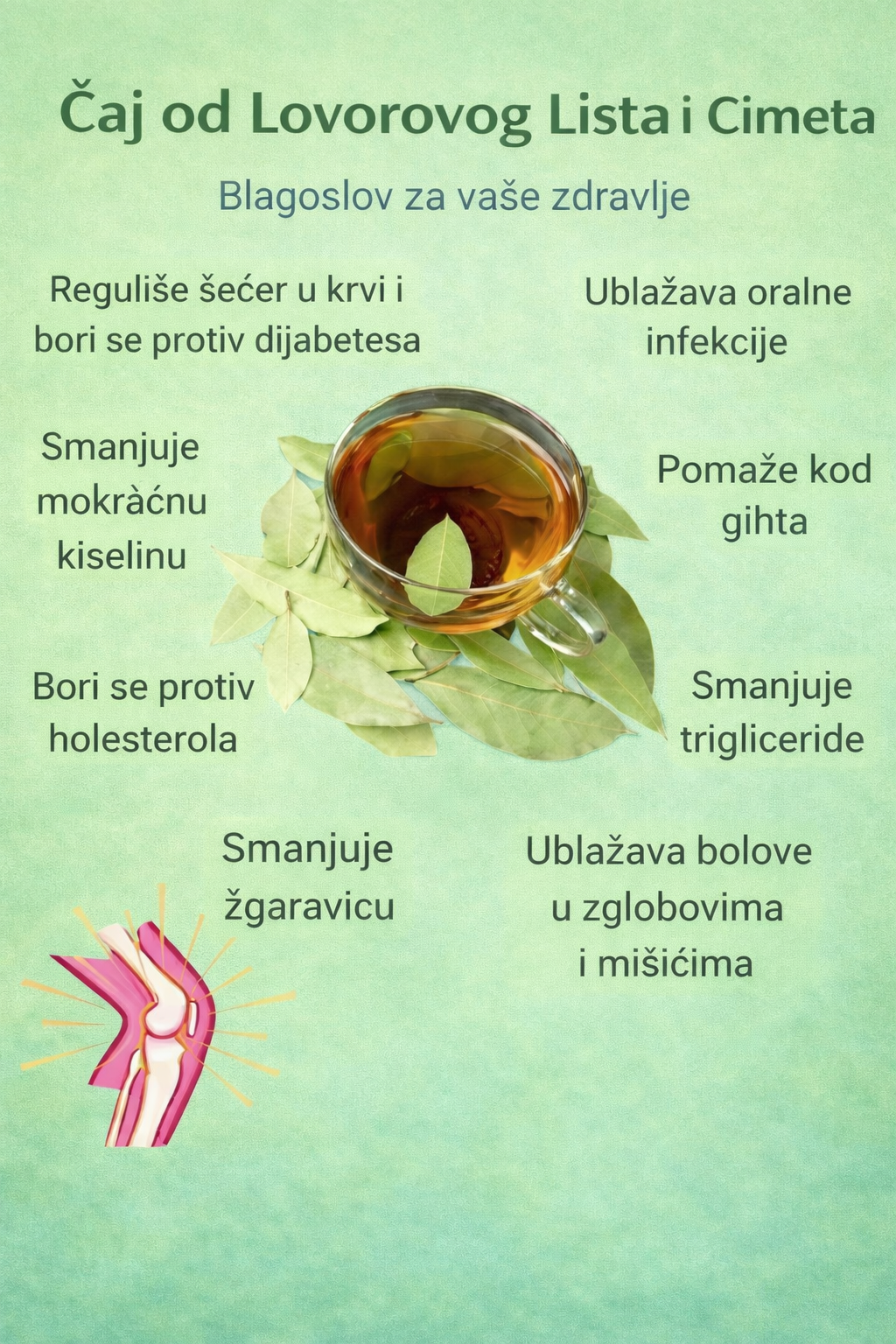 Čaj od lovorovog lista i cimeta je tradicionalni napitak koji se u narodnoj medicini koristi kao prirodna podrška organizmu. Ova kombinacija je poznata po svom povoljnom djelovanju na metabolizam, probavni sistem i opće zdravstveno stanje.