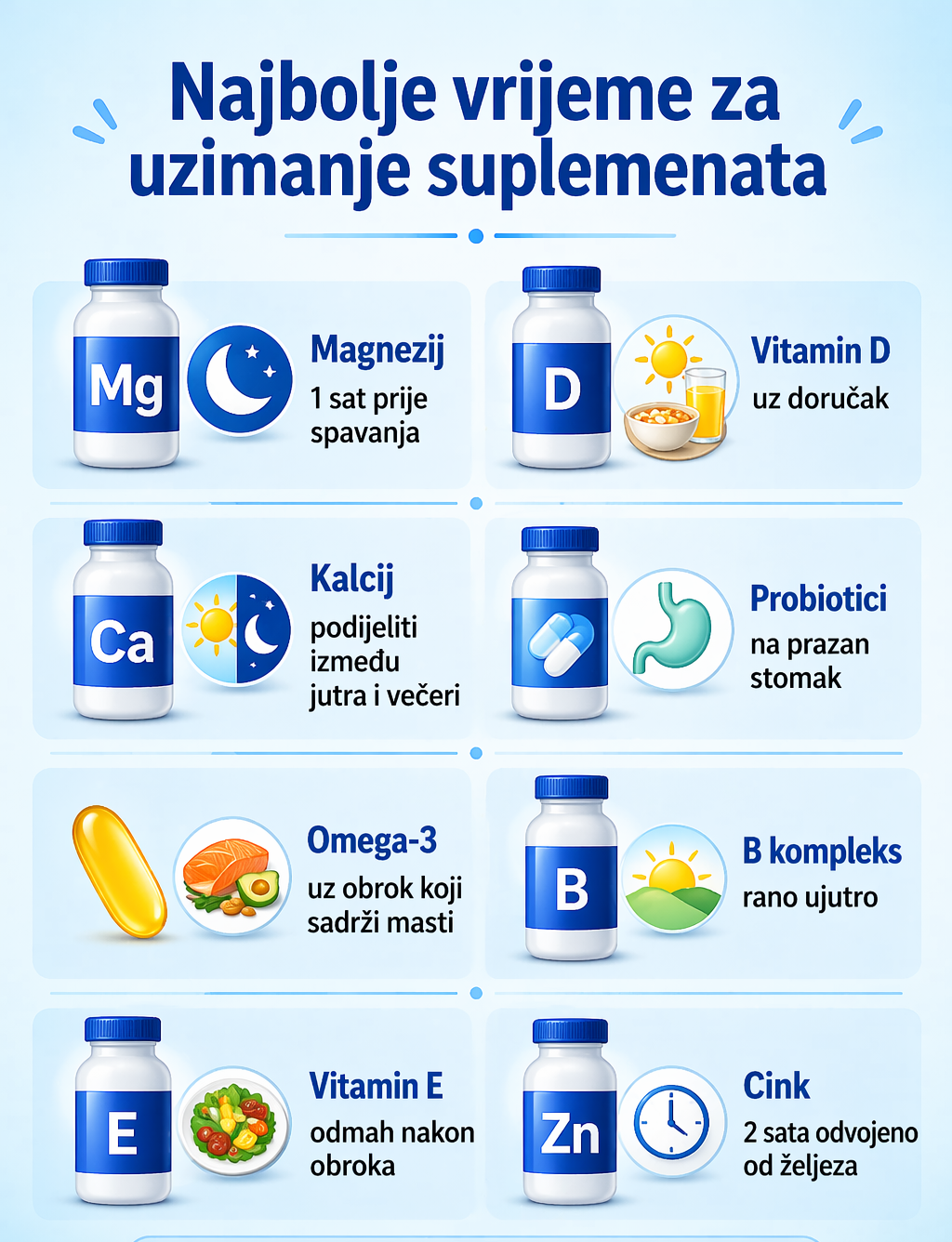 Uzimanje suplemenata nije samo stvar onoga što uzimate – već i kada ih uzimate. Vremenski raspored može napraviti veliku razliku u tome koliko dobro vaše tijelo apsorbuje hranjive tvari i koliko su učinkovite 🕒