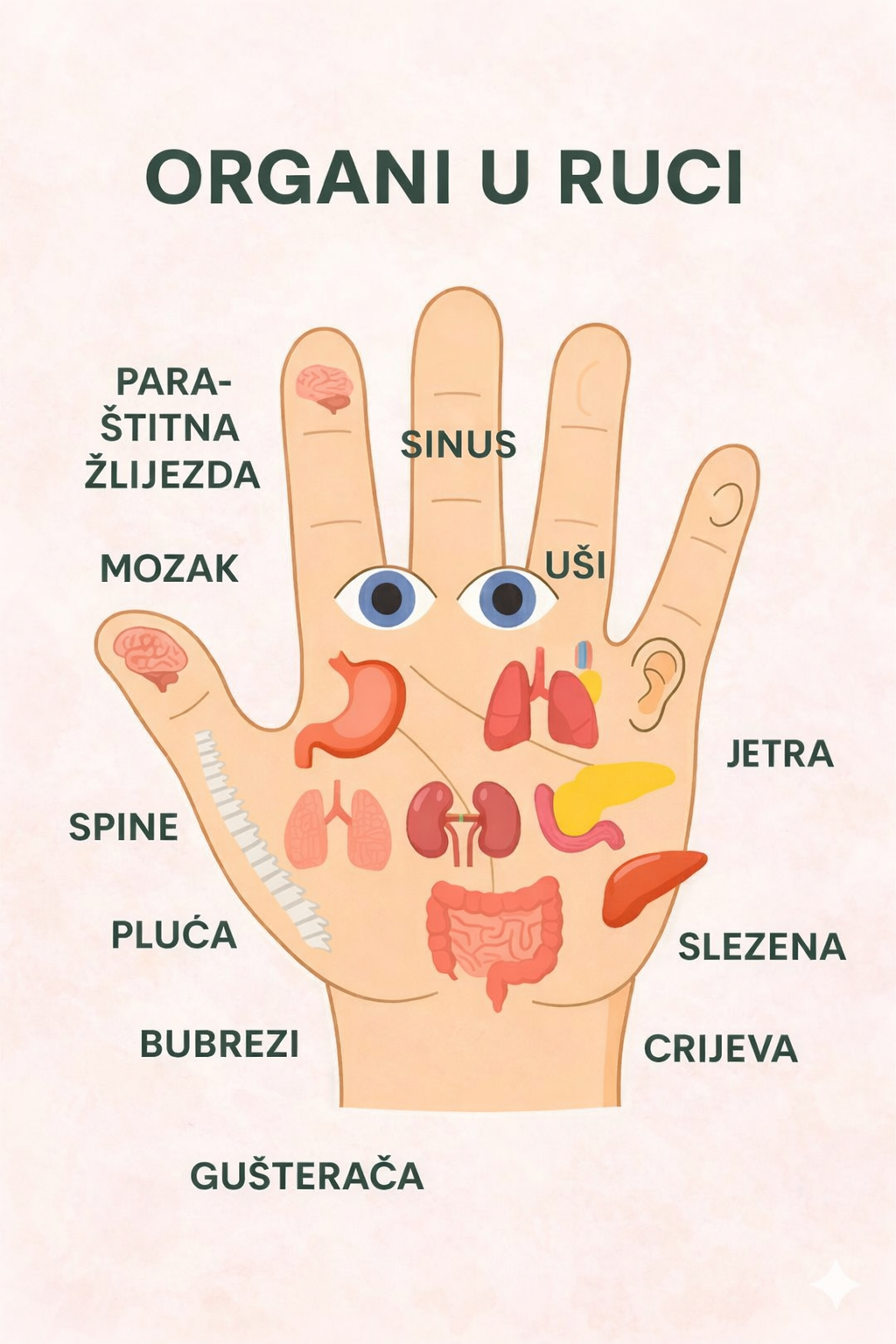 Ova ilustracija nudi vizualni prikaz rasporeda glavnih organa u ruci, prateći principe holističkih metoda poput Su Jok terapije (korejska terapija šake i stopala) ili opšte akupresure dlana. Karta sugerira da se stimulacijom određenih tačaka na dlanu i prstima može uticati na zdravlje i funkcije povezanih organa u tijelu.