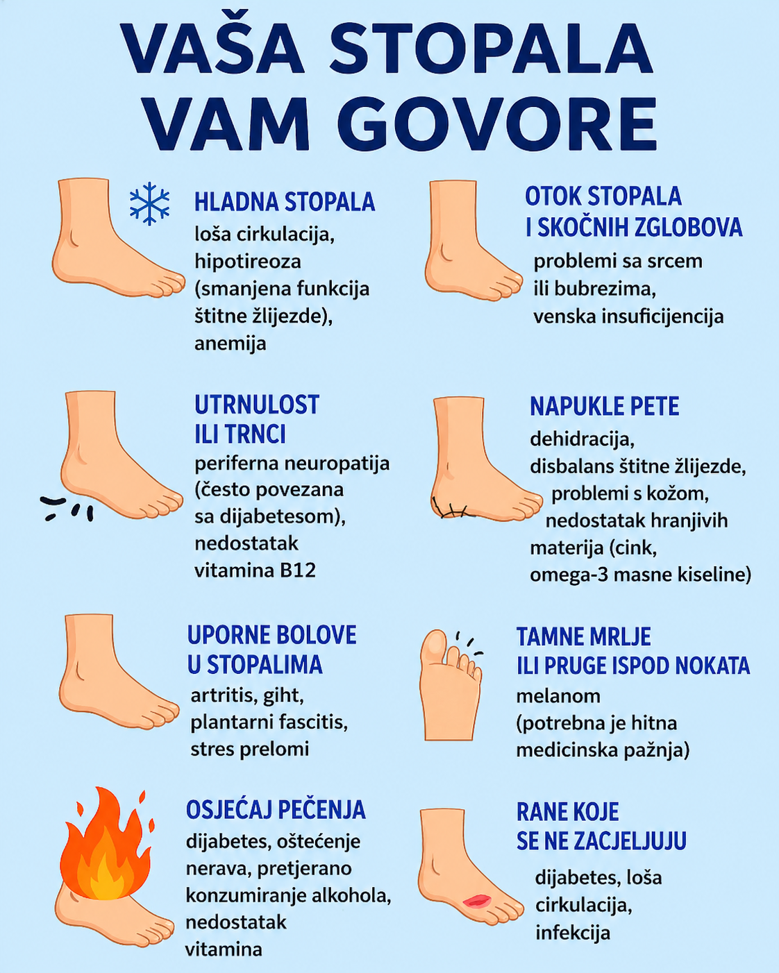 Često ukazuju na lošu cirkulaciju, hipotireozu, anemiju ili dijabetes.