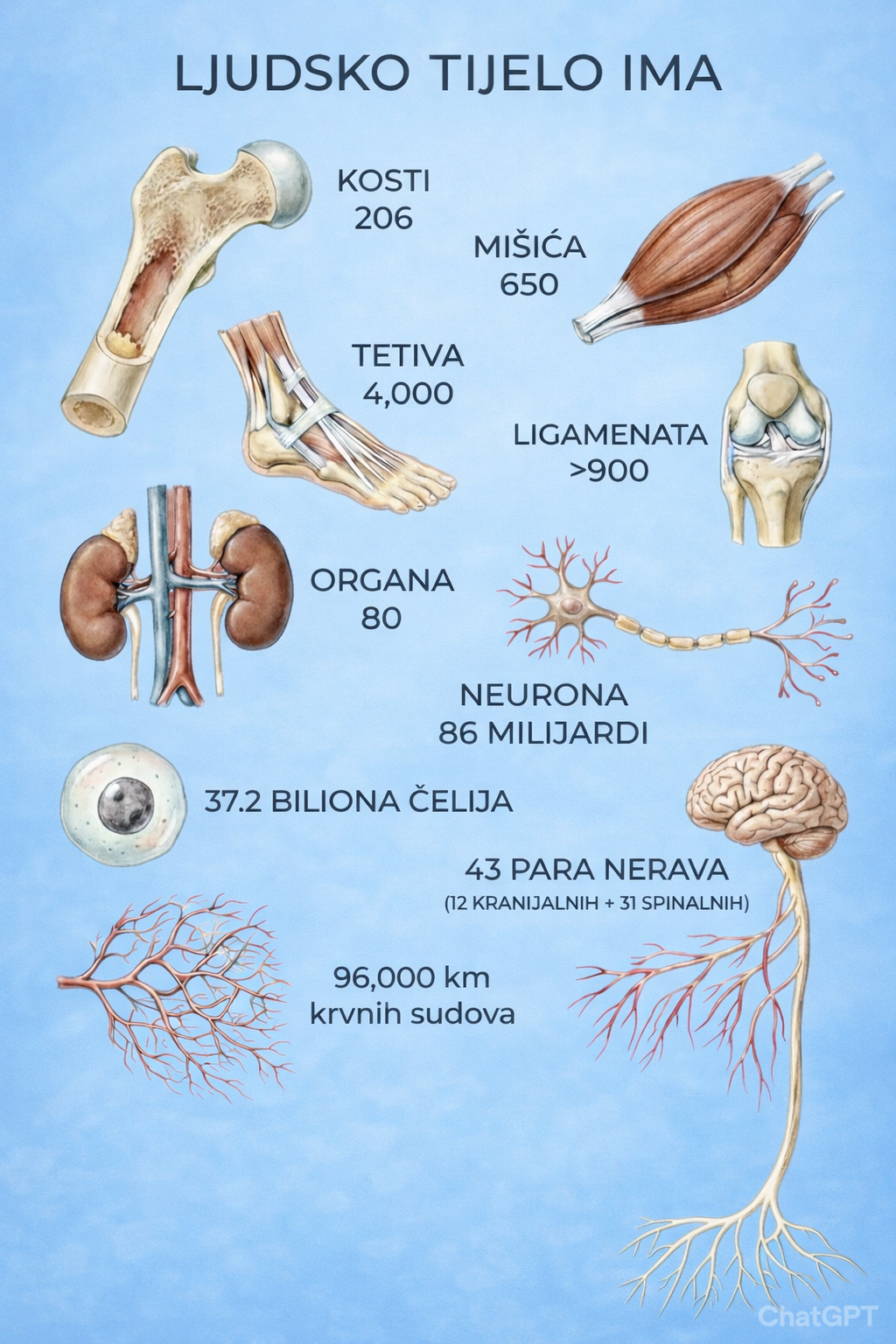 Ljudsko tijelo je izuzetno složen i savršeno usklađen sistem sastavljen od milijardi ćelija, organa i struktura koje zajedno omogućavaju život, kretanje, razmišljanje i prilagođavanje okoline. Ova infografika prikazuje neke od najzanimljivijih činjenica o ljudskom organizmu.