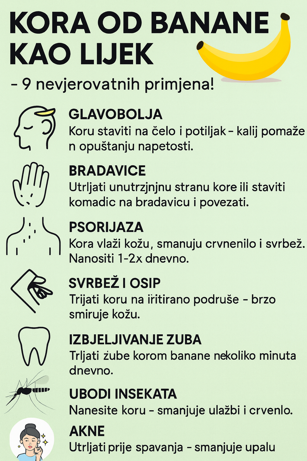 Akne – Piling banane će smanjiti upalu i iritaciju, i spriječiti izbijanje novih akni. Utrljajte koru banane na akne prije odlaska na spavanje.