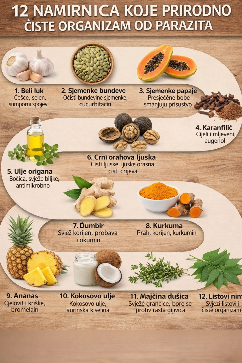 Prirodna hrana se koristi vekovima za podršku odbrambenom sistemu tela i poboljšanje zdravlja probavnog sistema. Mnoge namirnice biljnog porekla sadrže antimikrobna, protivupalna i detoksikaciona jedinjenja koja mogu pomoći u stvaranju nezdravog okruženja za štetne parazite, a istovremeno podržavaju opšte blagostanje. Namirnice prikazane na slici su dobro poznate po svojim snažnim prirodnim zdravstvenim prednostima.