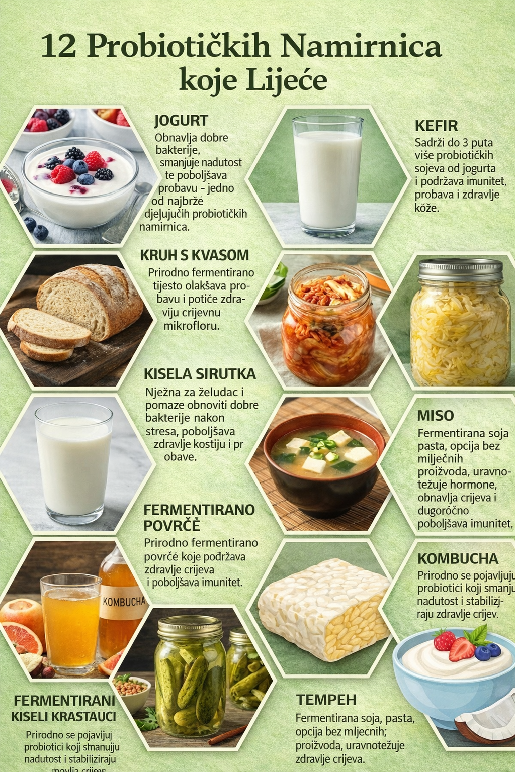 Probiotička hrana igra vitalnu ulogu u održavanju zdravog probavnog sistema i jačanju cjelokupnog imuniteta. Ova hrana je bogata korisnim bakterijama koje podržavaju zdravlje crijeva, poboljšavaju probavu i pomažu tijelu da efikasnije apsorbira hranjive tvari. Slika ističe neke od najmoćnijih probiotičkih namirnica koje mogu prirodno liječiti i zaštititi tijelo.