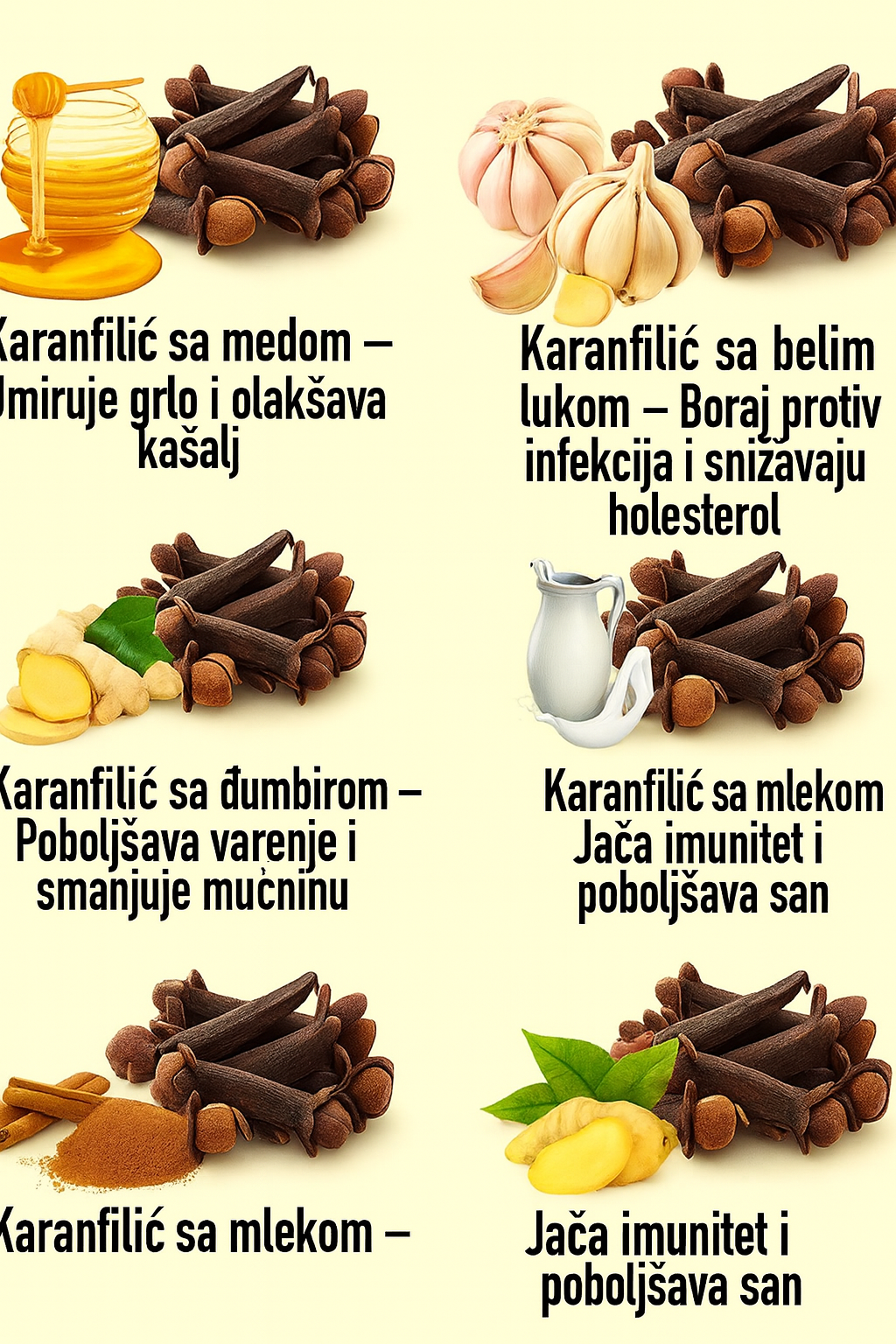 Način upotrebe: Dodajte nekoliko zgnječenih karanfilića u žlicu meda i uzimajte kao lijek za umirivanje grla. Alternativno, možete napraviti topli napitak s medom i karanfilićem kako biste ublažili kašalj. - KARANILIĆI S BIJELIM LUKOM – BORI SE PROTIV INFEKCIJA I SNIŽAVA HOLESTEROLSTEROL