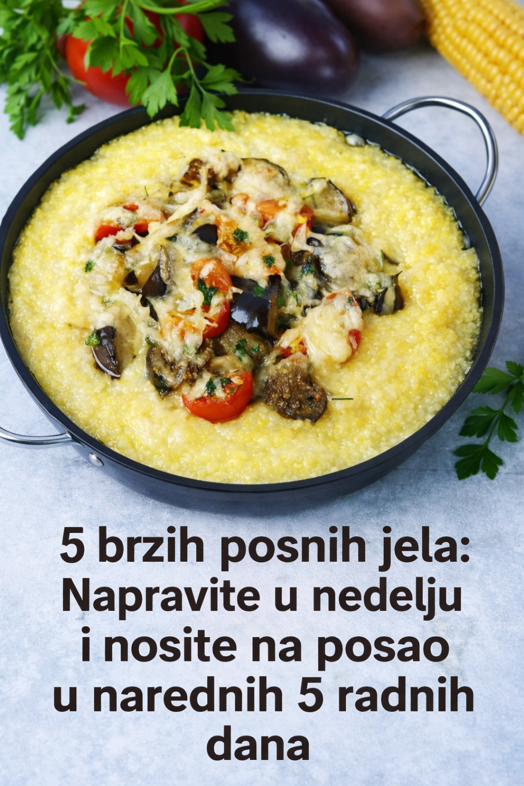 U nastavku sledi pet konkretnih i jednostavnih posnih jela, koja se lako pripremaju, mogu se čuvati u frižideru i poneti na posao — jedno jelo za svaki radni dan, od ponedeljka do petka.