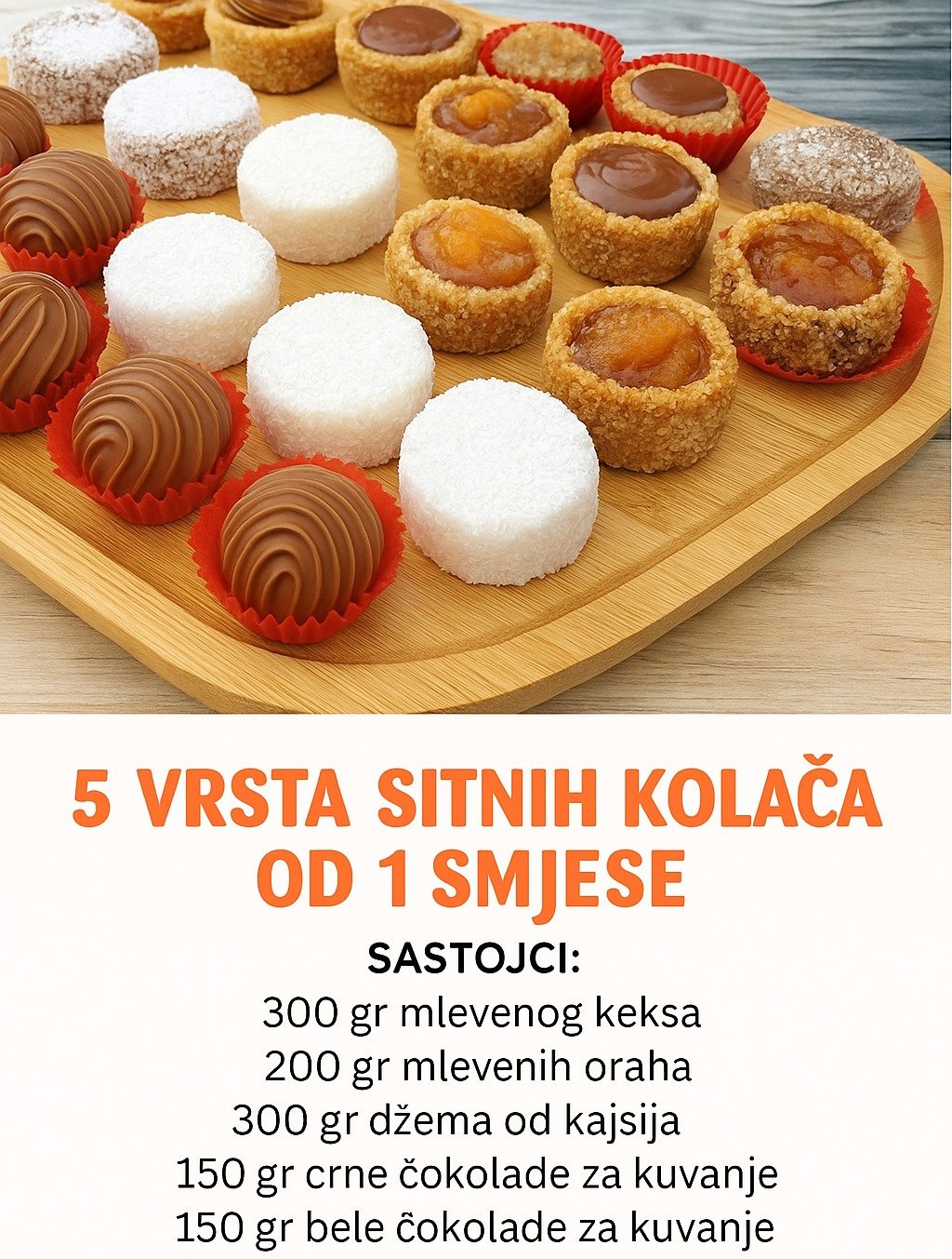 Ako ste u potrazi za brzim i jednostavnim načinom pripreme više vrsta kolača, ovaj recept je pravi izbor za vas. Kombinacija mljevenog keksa, mljevenih oraha, džema od kajsija i nekoliko osnovnih sastojaka kao što su čokolada, kokosovo brašno i lješnjaci stvara bogatstvo okusa i tekstura. Svaka od ovih poslastica nudi nešto posebno – od hrskavih korpica, preko sočnih valjaka, pa sve do bombica koje se tope u ustima.