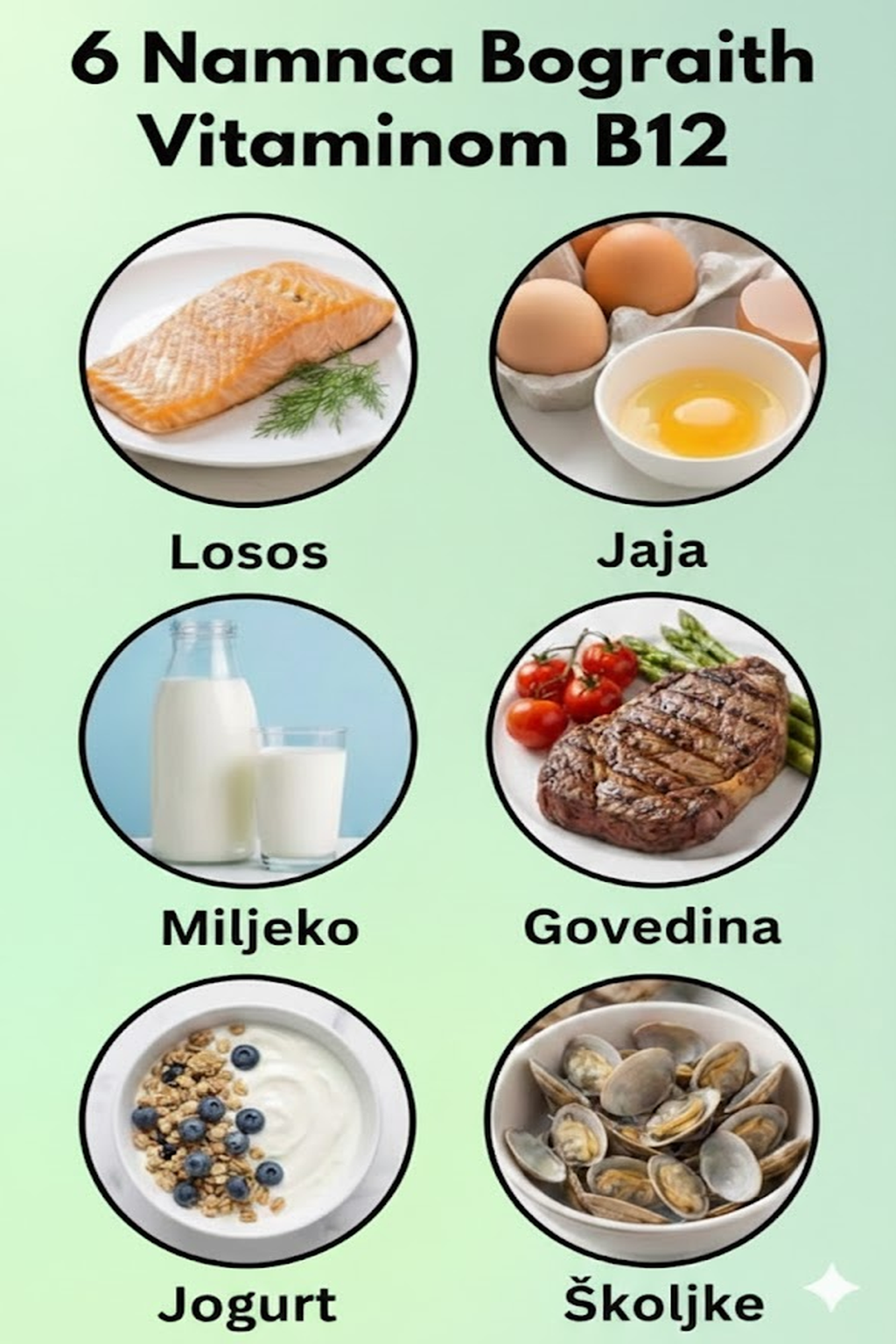 Vitamin B12 je esencijalni nutrijent koji igra ključnu ulogu u održavanju zdravlja i energije tijela. Podržava funkciju mozga, pomaže u stvaranju crvenih krvnih zrnaca i ključan je za zdrav nervni sistem. Nedostatak vitamina B12 može dovesti do umora, slabosti, problema s pamćenjem i anemije. Namirnice prikazane na slici su odlični prirodni izvori vitamina B12.