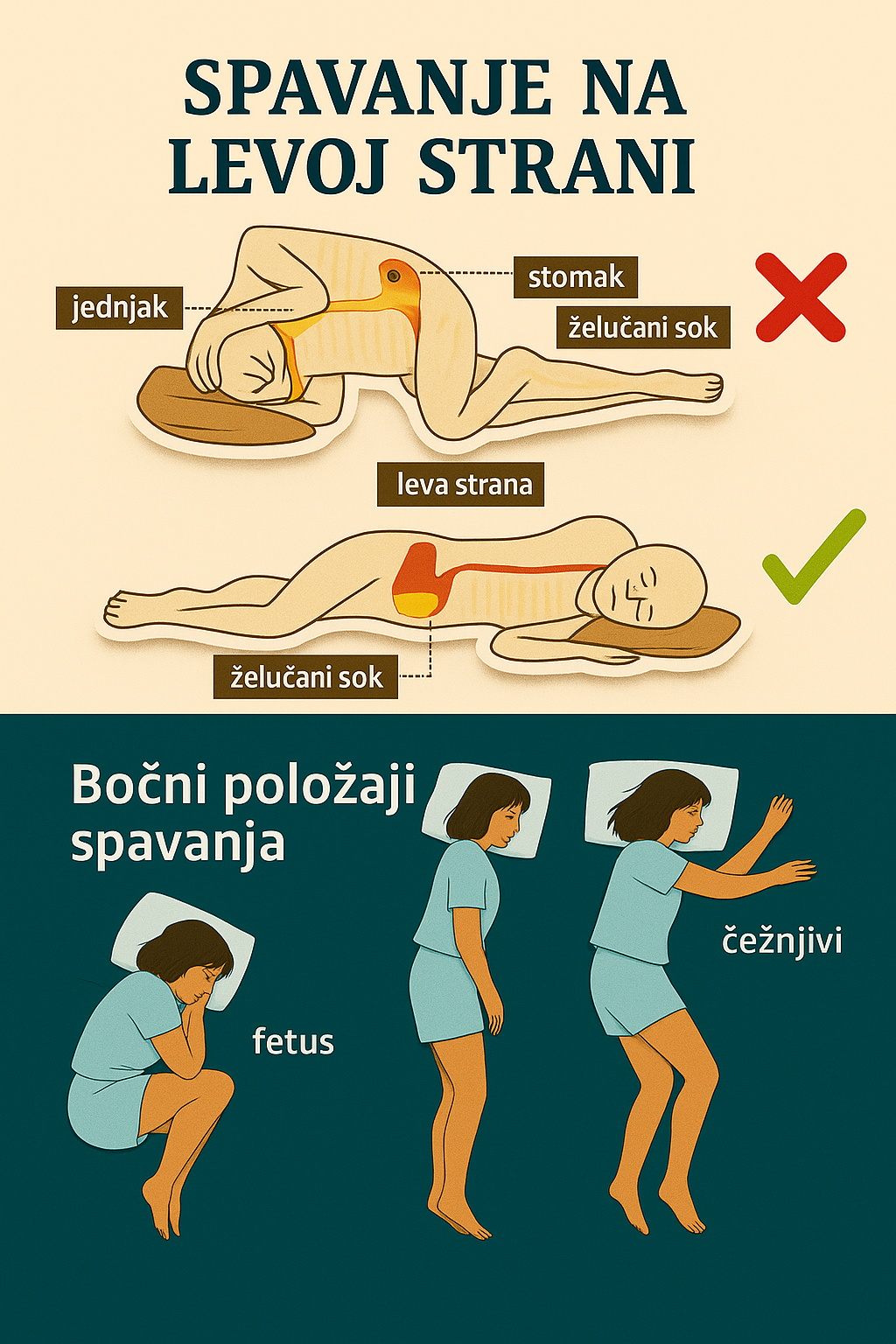 Spavanje na lijevoj strani je položaj koji se najviše preporučuje prema različitim istraživanjima. Spavanje na desnoj strani može uzrokovati probavne probleme, a spavanje na leđima se ne preporučuje osobama koje pate od apneje u snu ili astme.