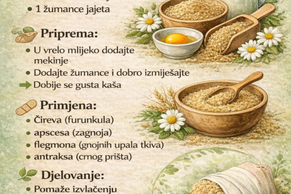 Jednostavan recept kako da sami sebi spremite obloge od mekinje, te ih koristite kao zdravu masu za liječenje čireva, apscesa, antraksa, kostobolje, zglobova i sličnih oboljenja. Pšenične posije ili mekinje se dobivaju iz vanjske ljuske zrna pšenice. Naime, strukturu pšeničnog zrna čine omotač (vanjski dio), endosperm (unutarnji dio) i klica. Mljevenjem u mlinu omotač postaje…