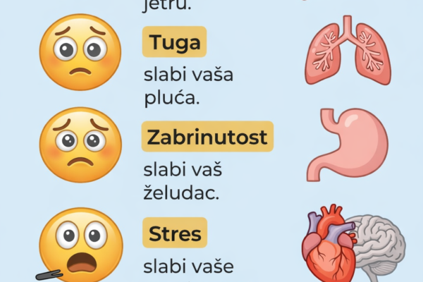 😡 Ljutnja🩺 Slabi vašu jetru– Kada emocije potiskujete ili ispaljujete, vaša jetra prima udarac. Vježbajte duboko disanje i konstruktivno ga otpustite. 😢 Tuga🩺 Slabi vaša pluća– Dugotrajna tuga ili gubitak mogu poremetiti disanje i funkciju pluća. Pokušajte razgovarati o tome, voditi dnevnik ili provoditi vrijeme u prirodi. 😟 Briga🩺 Slabi vaš želudac– Anksioznost može uzrokovati…