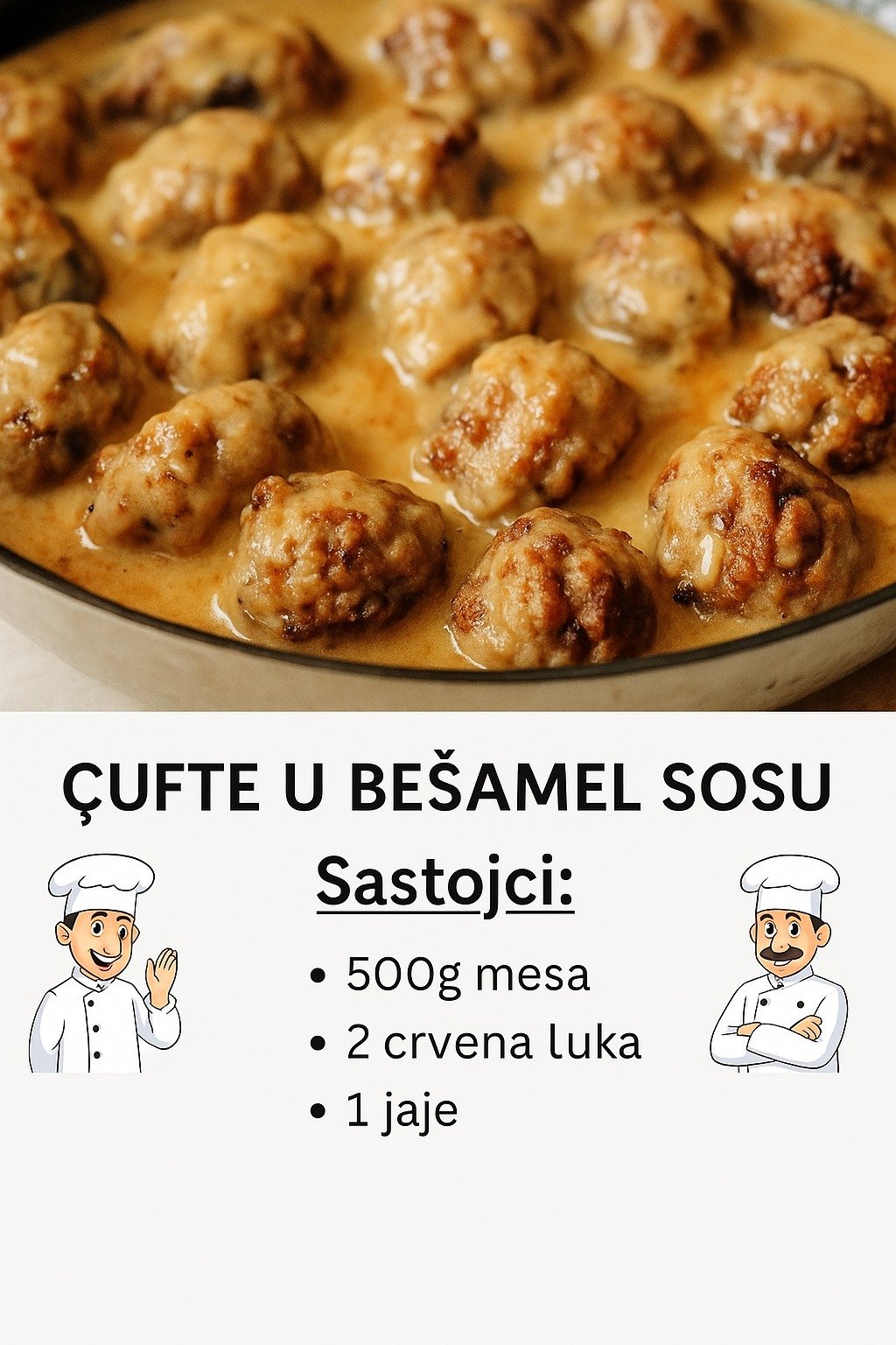 Ćufte u bešamel sosu poslužite uz pomftir i salatu po želji.