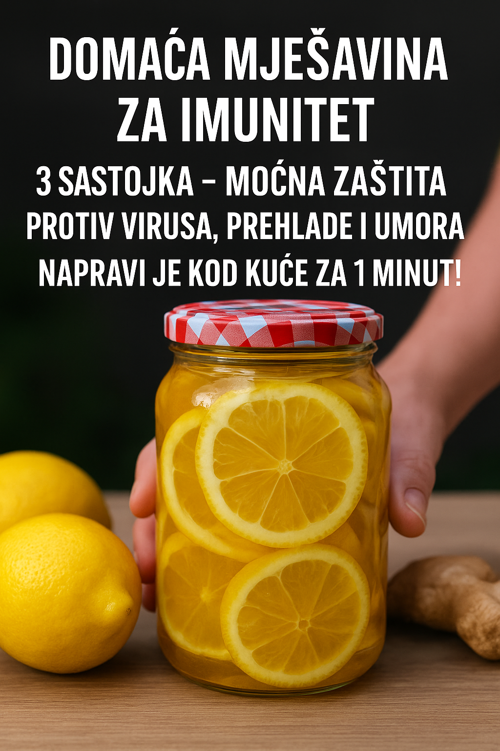 Limun potopite u vodu sa sodom bikarbonom, potom isperite hladnom vodom. Isjecite ga na kolutove i odstranite sjemenke. Đumbir isjecite na tanke kriške. Punite teglu naizmjenično kolutovima limuna, đumbirom i medom. Zatim dobro zatvorite, okrenite naopako i ostavite 24 sata. Možete držati do dvije sedmice na hladnom mjestu.