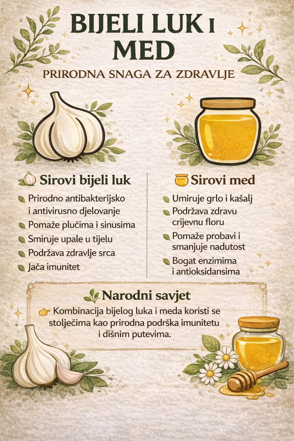 Zahvaljujući bjelom luku vaš imunitet je jači i lakše se bori sa klicama izazivačima bolesti. Zdrav i jak imunološki sistem je takođe bitan za prevenciju ozbiljnih rizika kao što je pojava raka. Zato je važno da preduzmete sve što je u vašoj moći kako biste se zaštitili. Kombinacija meda i bjelog luka je jednostavan, lak i jeftin način da učinite nešto za svoj imunitet.