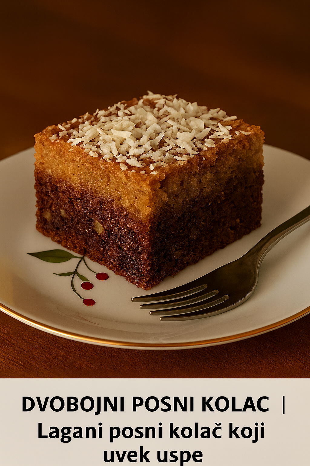 Ovo je jedan od onih jednostavnih posnih kolača koji se uvijek pravi „usput“, a ispadne mekano, pahuljasto i prelepo na oko. Dvobojni efekat daje mu poseban čar, a sastojci su toliko jednostavni da ga možete pripremiti bilo kad – za porodičnu desert, post, brzu poslasticu uz kafu ili kada želite nešto lagano, a ipak ukusno. Kolač je mekan i sočan čak i sutradan, što ga čini idealnim receptom koji obavezno treba imati pri ruci.