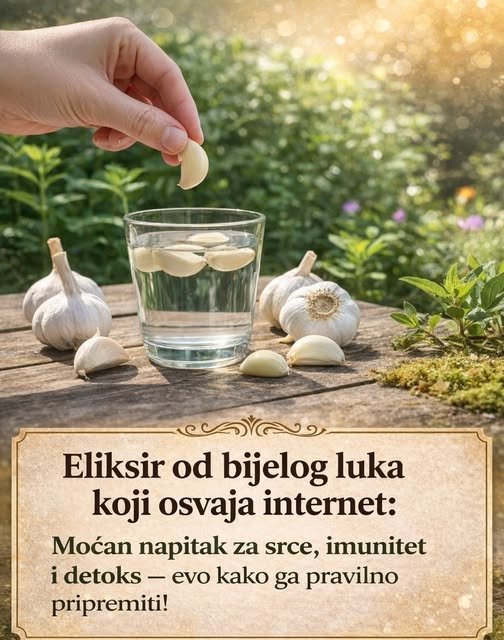Zdrobite ili narežite 1-2 svježa češnja bijelog luka i dodajte ih u čašu tople vode. Ostavite da odstoji nekoliko minuta prije pijenja. Za najbolje rezultate, konzumirajte na prazan želudac.