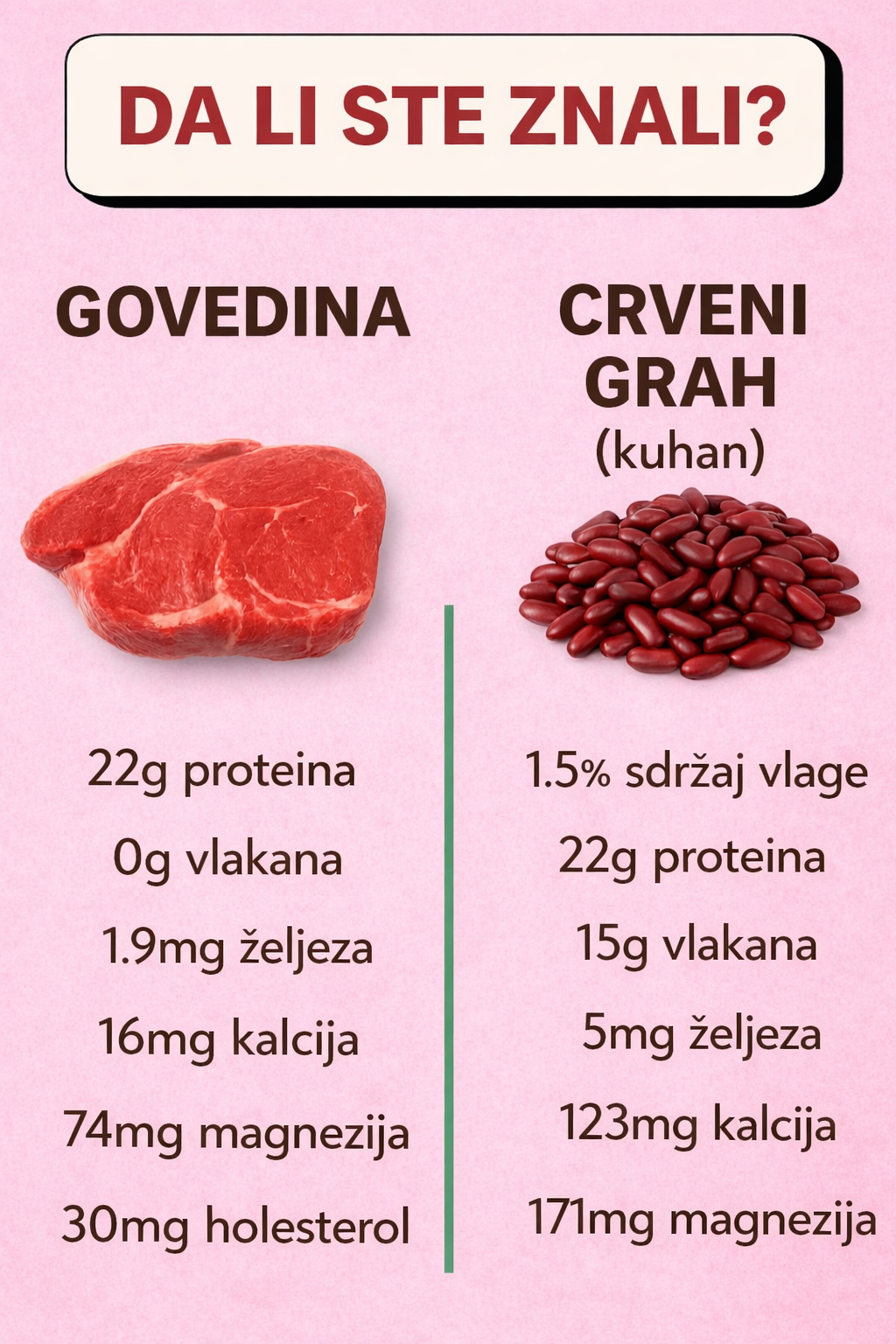 Zaključno, iako govedina ima kvalitetan protein, crveni grah pruža istu količinu proteina, više vlakana, veće količine minerala, nula holesterola i nižu cijenu. To ga čini savršenim izborom za one koji žele balansiranu, zdravu i biljnu prehranu. Dodavanjem crvenog graha u jelovnik možete poboljšati svoje zdravlje i uštedjeti novac. 🌿