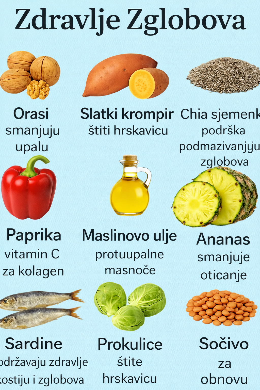 Održavanje zdravih zglobova je ključno za održavanje aktivnosti, fleksibilnosti i bez bolova kako starimo. Slika ističe razne namirnice bogate hranjivim tvarima koje mogu pomoći u smanjenju upale, zaštiti hrskavice i podršci cjelokupnoj funkciji zglobova. Uključivanjem ovih namirnica u svoju svakodnevnu prehranu možete prirodno ojačati zglobove i poboljšati pokretljivost.