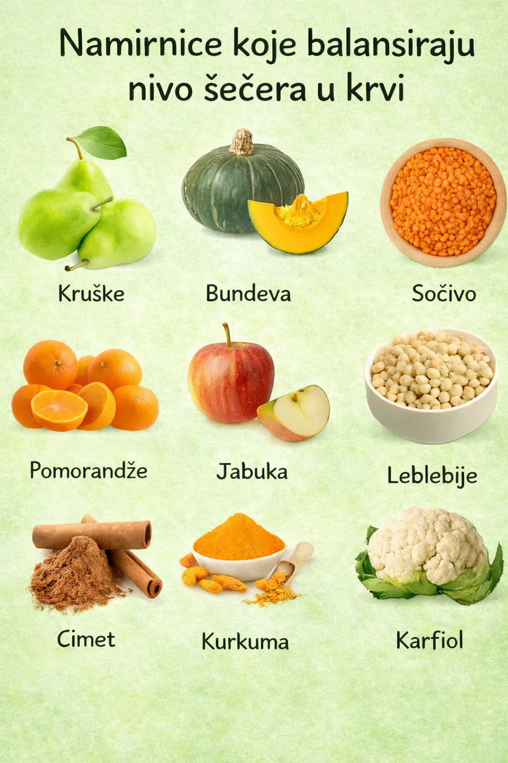 Održavanje stabilnog nivoa šećera u krvi je ključno za cjelokupno zdravlje, posebno za osobe koje se bore s dijabetesom, inzulinskom rezistencijom ili problemima s težinom. Slika ističe nekoliko prirodnih namirnica za koje se zna da pomažu u efikasnoj regulaciji nivoa šećera u krvi. Ove namirnice su bogate vlaknima, antioksidansima, vitaminima i protuupalnim spojevima koji podržavaju metaboličko zdravlje.