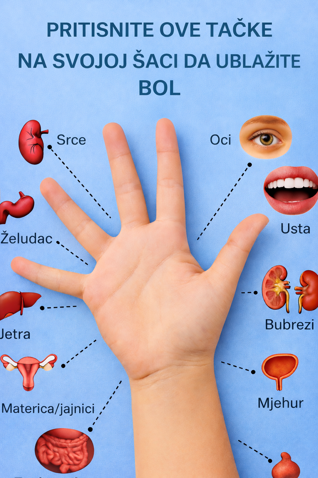 Naše ruke su moćnije nego što često mislimo. Prema tradicionalnim praksama poput akupresure i refleksologije, specifične tačke na dlanu povezane su s različitim organima i sistemima tijela. Slika ilustruje kako pritisak na određena područja ruke može pomoći u ublažavanju boli i nelagode prirodno, bez lijekova.