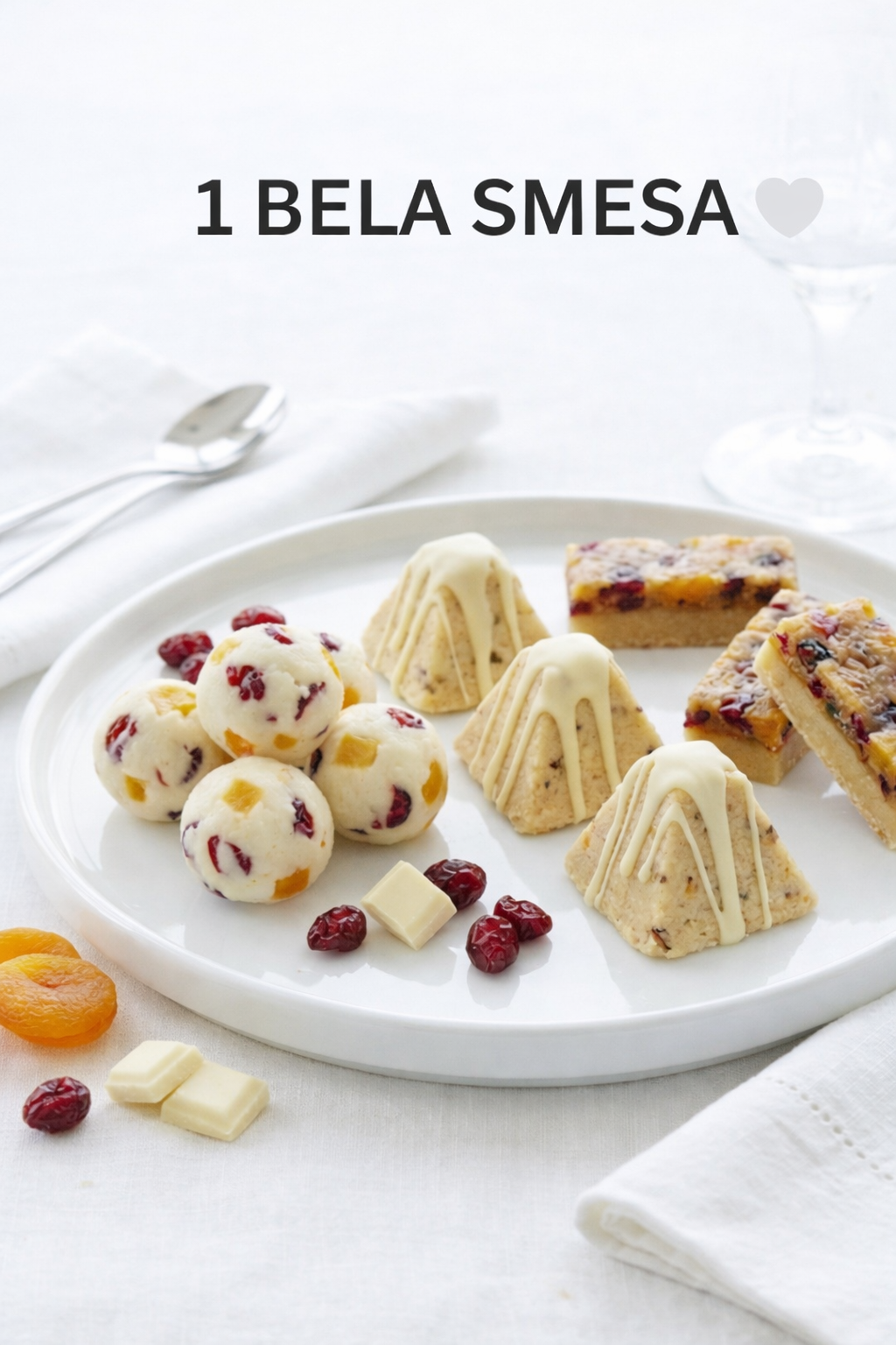 Ovaj prekrasni desert, često nazivan “Jedan bijeli miks”, je mekani, kremasti slatkiš bez pečenja napravljen od bijele čokolade, suhog voća i keksa. Njegov nježan izgled i bogat okus čine ga savršenim za vrijeme čaja, porodična okupljanja ili svečane prilike. Kombinacija bijele čokolade, maslaca i voća stvara glatku teksturu s ugodnom ravnotežom slatkoće.