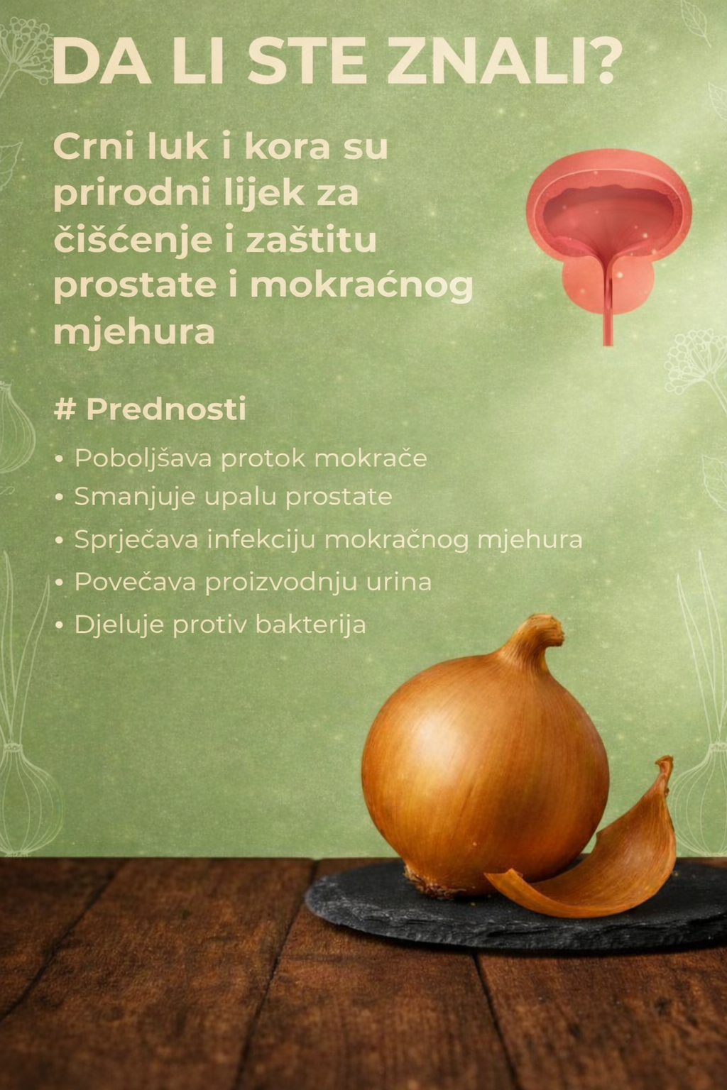 Crni luk i njegova kora tradicionalno se koriste kao prirodni lijek za podršku zdravlju prostate i mokraćnog mjehura. Zahvaljujući svojim snažnim antibakterijskim i protuupalnim svojstvima, crni luk može pomoći tijelu da održi zdrav urinarni sistem i zaštiti od uobičajenih infekcija.