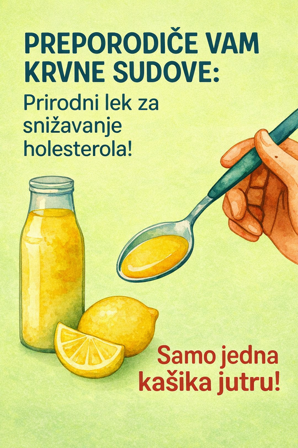 Prirodni lijekovi se generacijama koriste za podršku cjelokupnom zdravlju, a napitci ili mješavine na bazi limuna su među najpopularnijima. Slika ističe jednostavnu naviku – uzimanje jedne kašike ujutro – često povezanu s podrškom krvnim sudovima i ravnoteži holesterola kada se kombinuje sa zdravim načinom života.