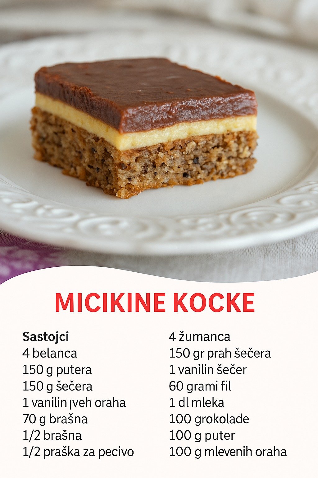 Micikine kocke nisu samo desert – one su podsetnik na vreme kada se kolač pravio s merom, ali i s ljubavlju. Ovaj recept kombinuje jednostavne sastojke sa pažljivim tehnikama kako bi se dobio kolač koji nije samo lep na oko, već i neodoljiv na nepce.