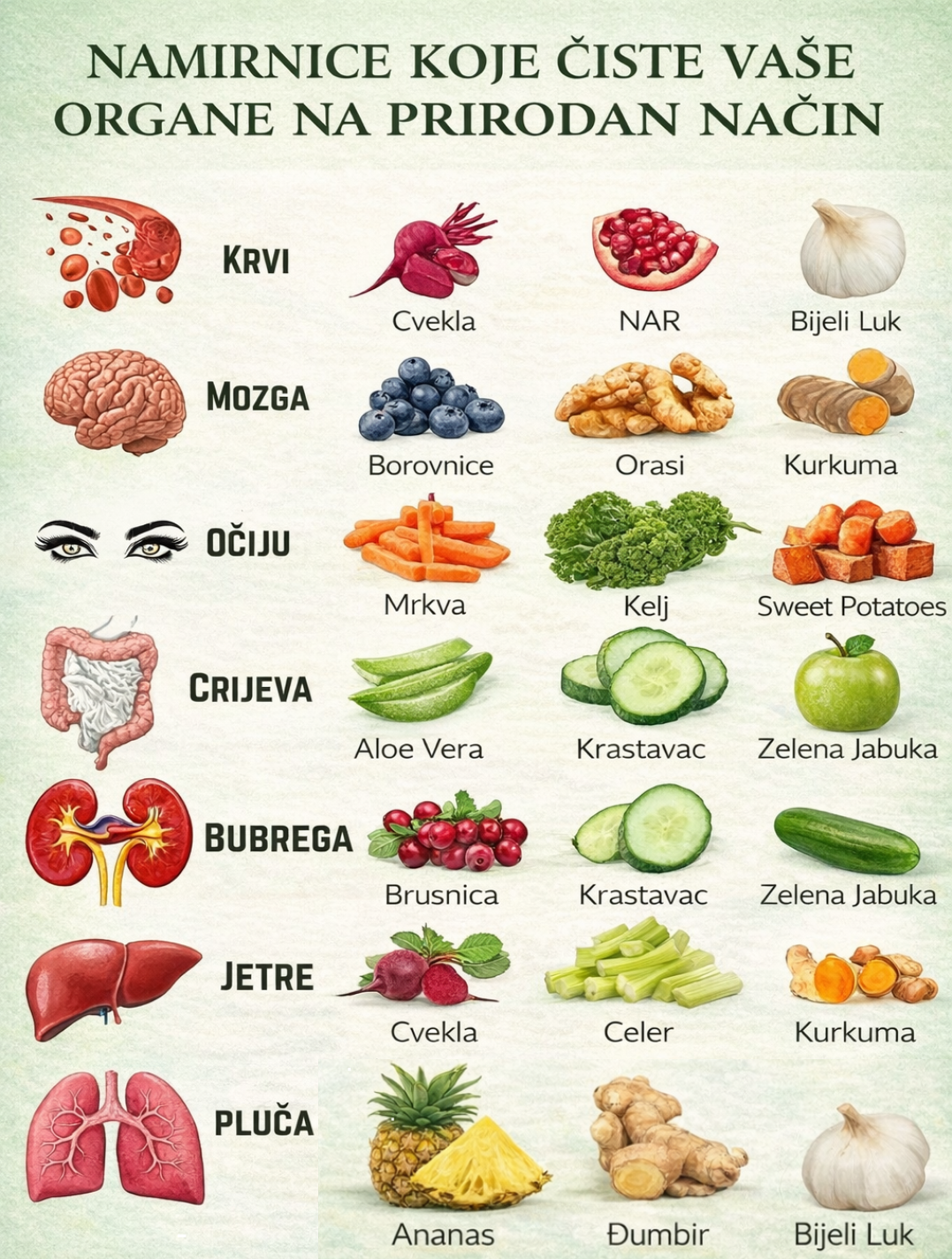 Održavanje zdravog tijela počinje hranjenjem vaših organa. Priroda pruža moćne namirnice koje pomažu u detoksikaciji, zaštiti i poboljšanju funkcije vitalnih organa poput jetre, bubrega, mozga i pluća. Dodavanjem ovih prirodnih namirnica u vašu svakodnevnu prehranu možete podržati cjelokupno zdravlje i spriječiti mnoge uobičajene bolesti.