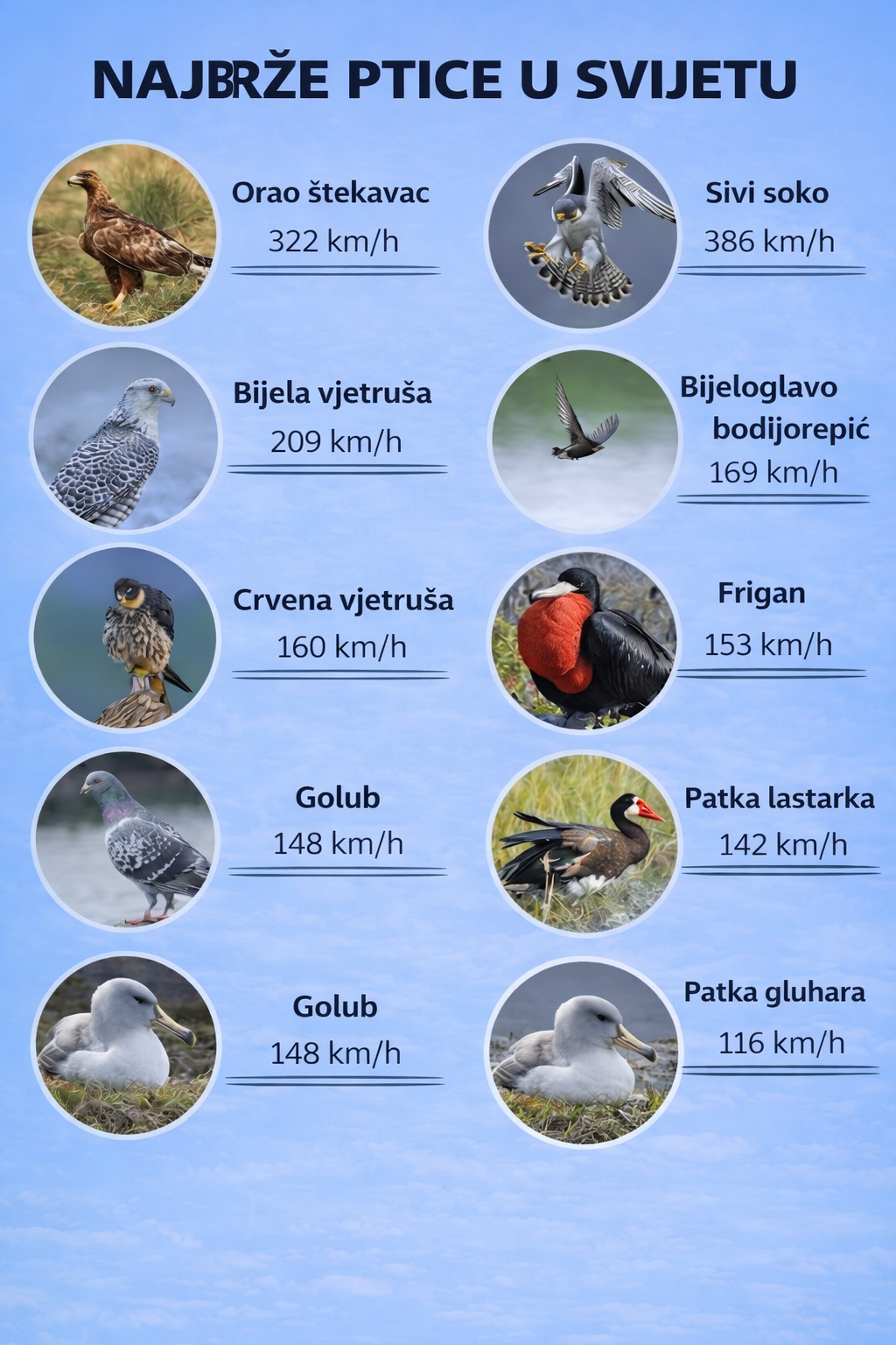 Brzina na nebu je moćna vještina preživljavanja. Ove ptice su stvorene za nevjerovatne performanse leta, od brzih zarona do jedrenja na velike udaljenosti 🌍