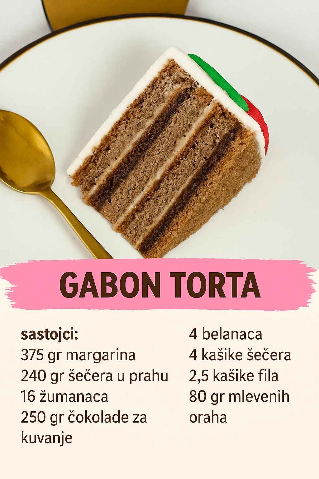 Ukoliko tražite tortu koja će podjednako zadovoljiti ukus i oko, Gabon torta je pravi izbor. Isprobajte je, uživajte u svakom zalogaju i podijelite ovo kulinarsko zadovoljstvo s onima koje volite.