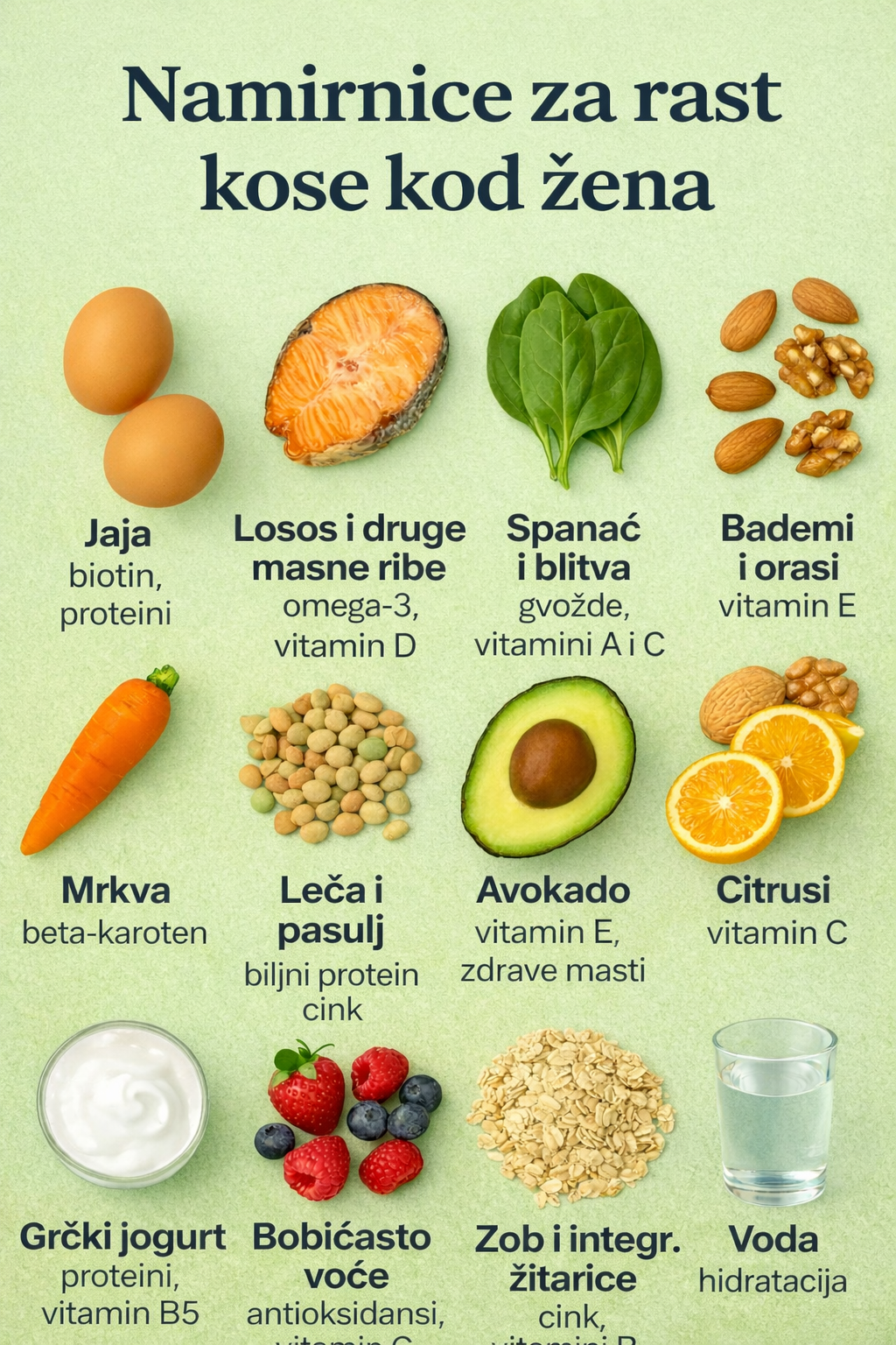 Zdrava, jaka i sjajna kosa ne zavisi samo od njege spolja, već prije svega od pravilne ishrane. Folikuli kose trebaju vitamine, minerale, proteine i zdrave masti kako bi kosa mogla rasti, obnavljati se i ostati jaka. U nastavku su namirnice koje imaju ključnu ulogu u rastu kose kod žene.