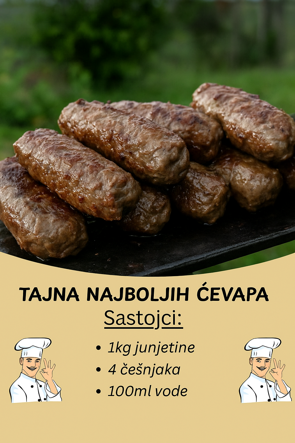 Sve što vam je potrebno za prave ćevape je 1,5 kg mljevene junetine, ½ kg janjetine, 4-5 češnja bijelog luka, 2% od ukupne količine mesa, soli i 2 kašičice sode bikarbone.