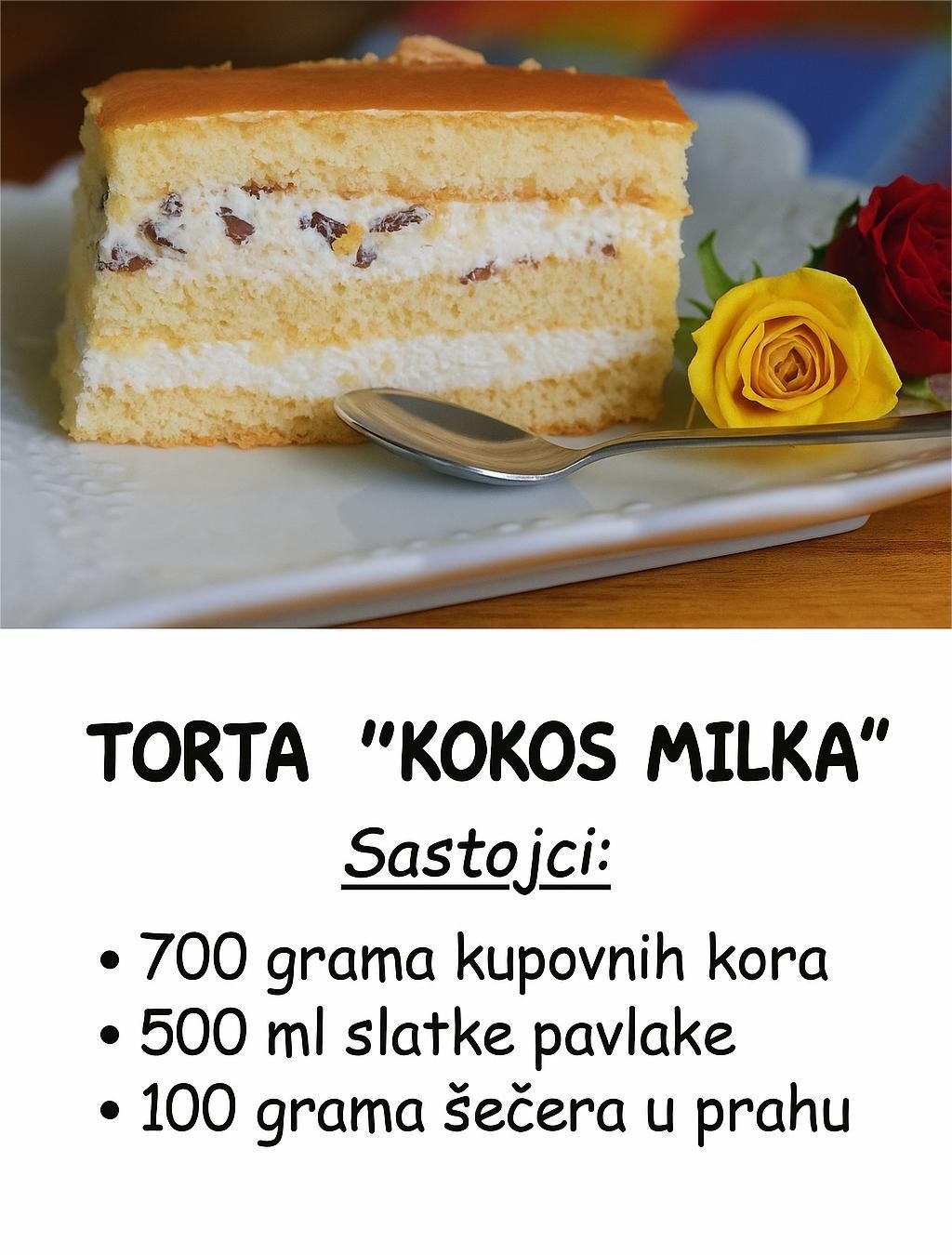 Torta kokos Milka je jednostavna, a ipak izuzetno ukusna poslastica koja neće razočarati. Sa kremastim slojevima i bogatim ukusom kokosa i čokolade, savršen je izbor za svaki događaj ili kao dnevni desert. Što je najbolje, ne zahteva pečenje, pa možete uživati u pripremi bez stresa. Ova torta je idealna za sve ljubitelje kokosa, a možete je prilagoditi i dodati omiljene sastojke po svom ukusu. Ukoliko ste u potrazi za brzim i jednostavnim receptom za tortu, koju možete napraviti unapred, torta kokos Milka je definitivno pun pogodak!